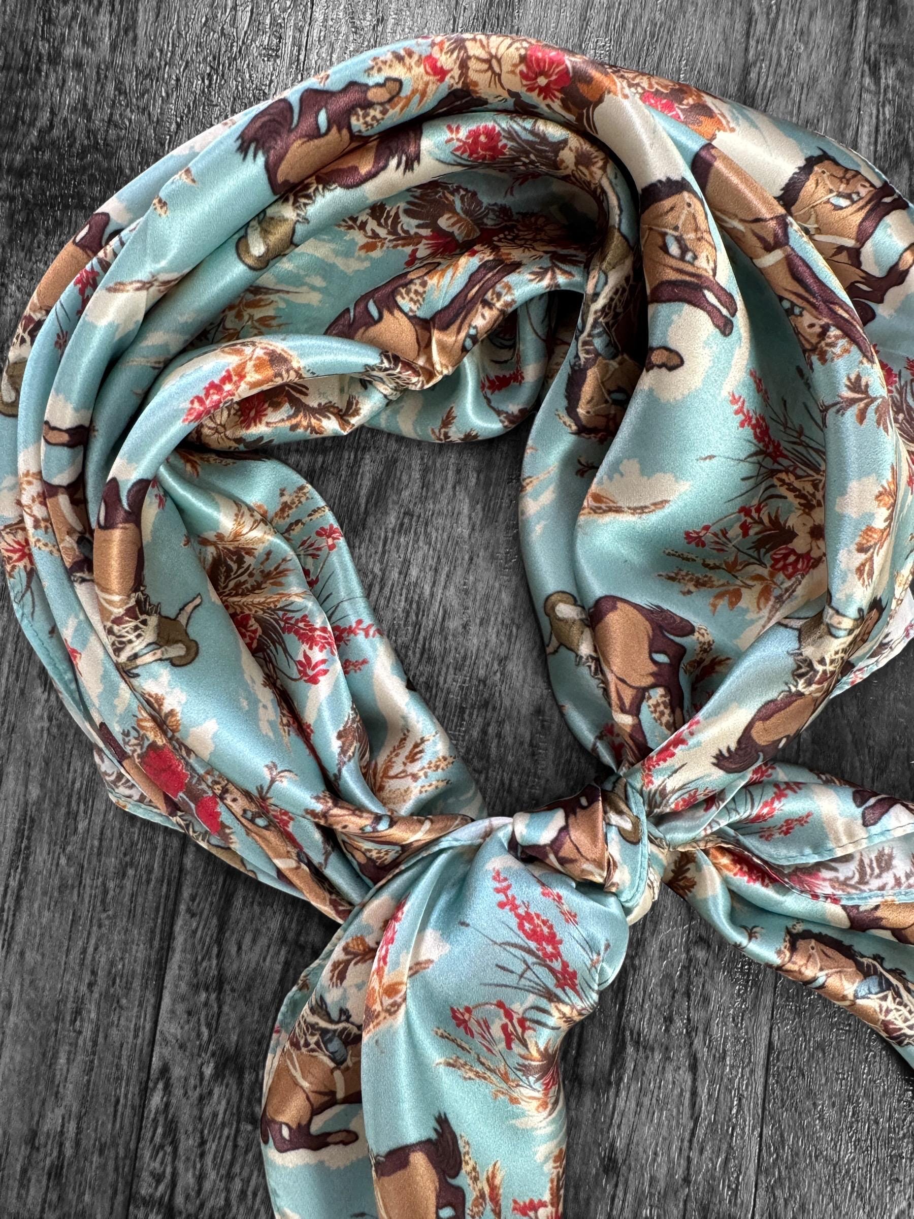 100% Silk Wild Rag Dusty Blue Cowboys and Floral by Double B Wild Rags