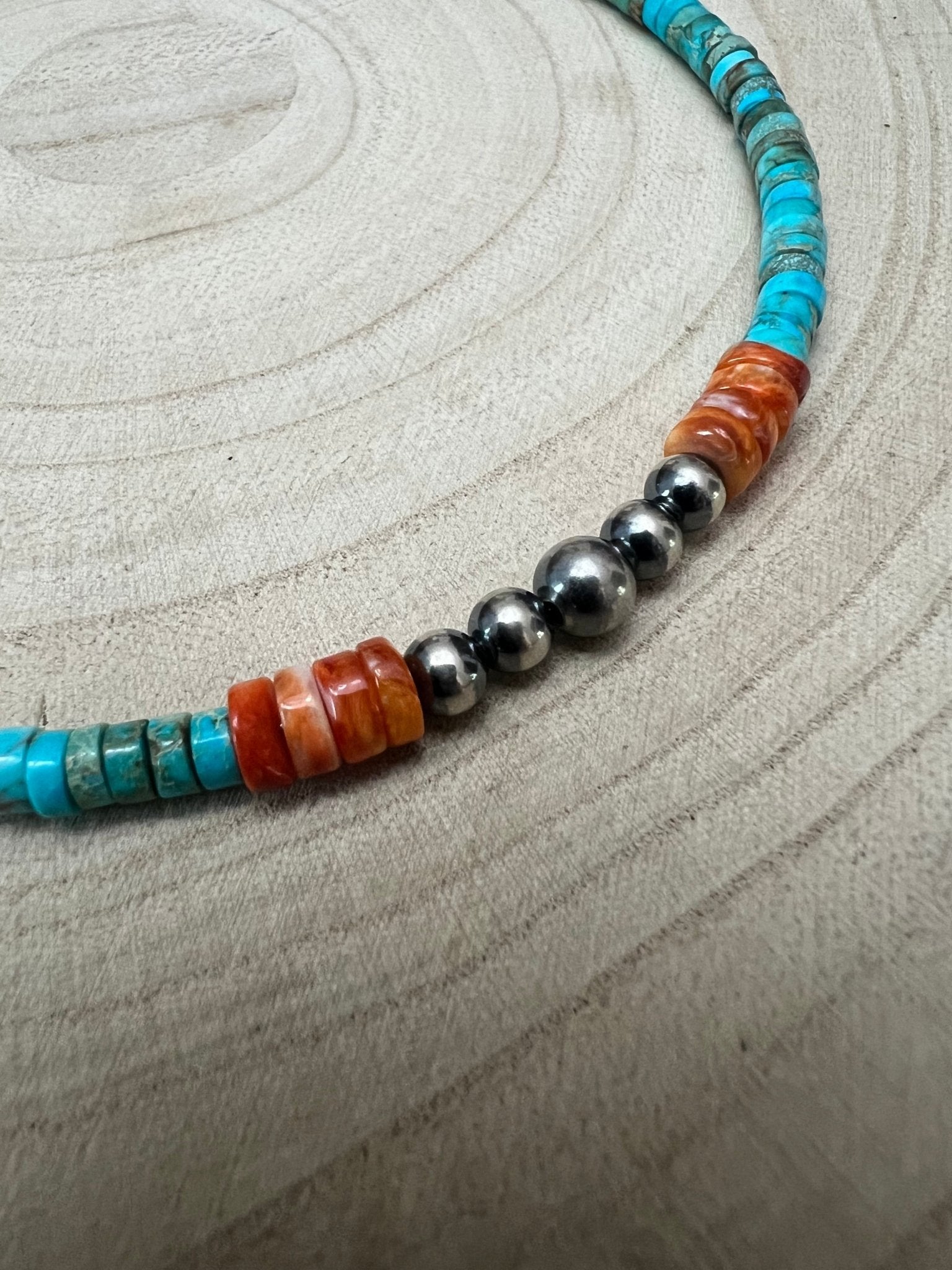 Get ready to add a touch of summer to your wardrobe with our beautiful 14 inch chokers! These chokers feature real spiny oyster beads measuring 4mm, variscite turquoise and sterling pearls measuring 6 and 5mm. The chain and latch are silver plated and adorned with gorgeous composite turquoise. Perfect for a casual and approachable look!