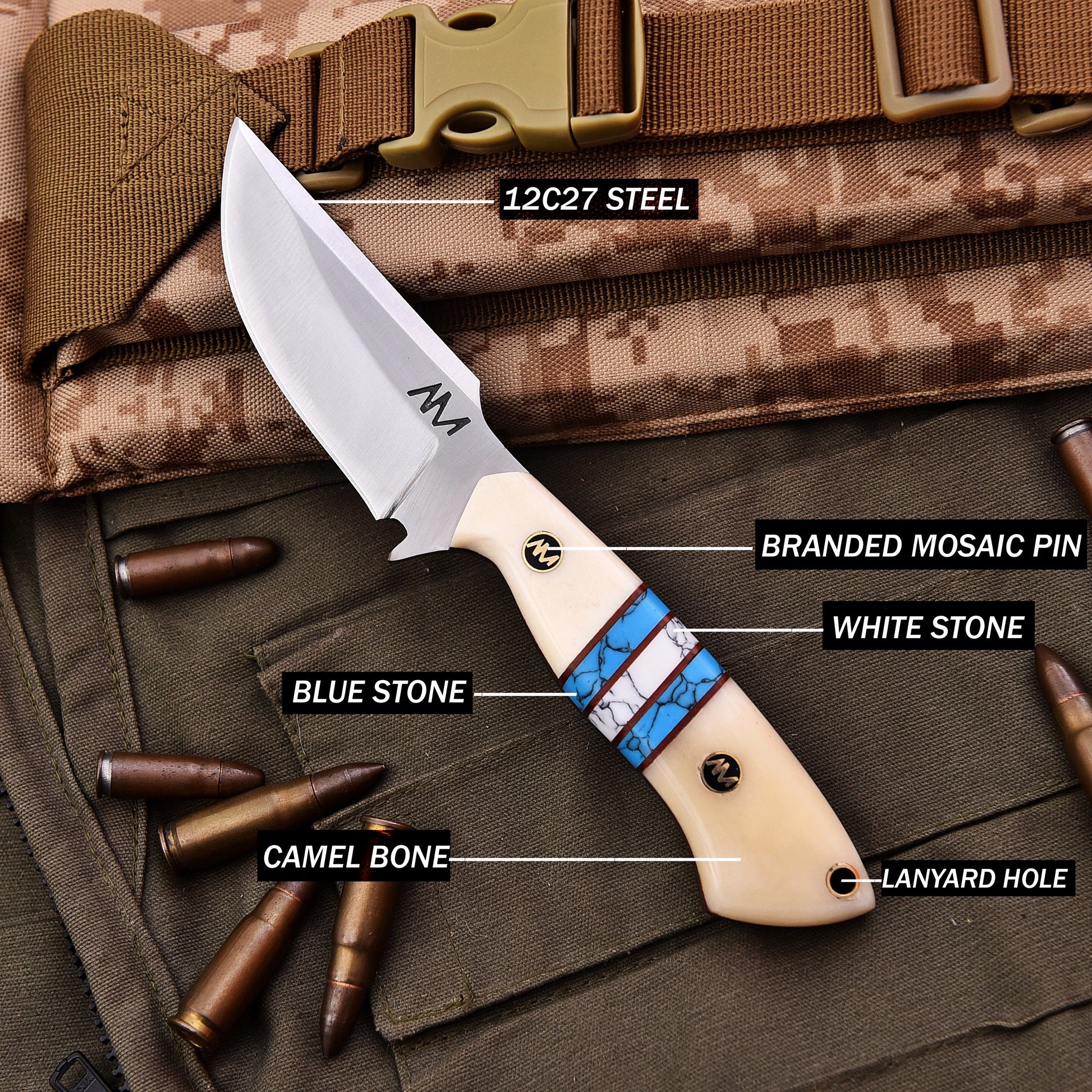 The AM Arctic is a masterfully crafted 8-inch fixed blade knife designed for hunters, campers, and outdoor adventurers who demand both performance and style. Built with precision and durability in mind, this knife isn’t just a tool—it’s a statement piece.