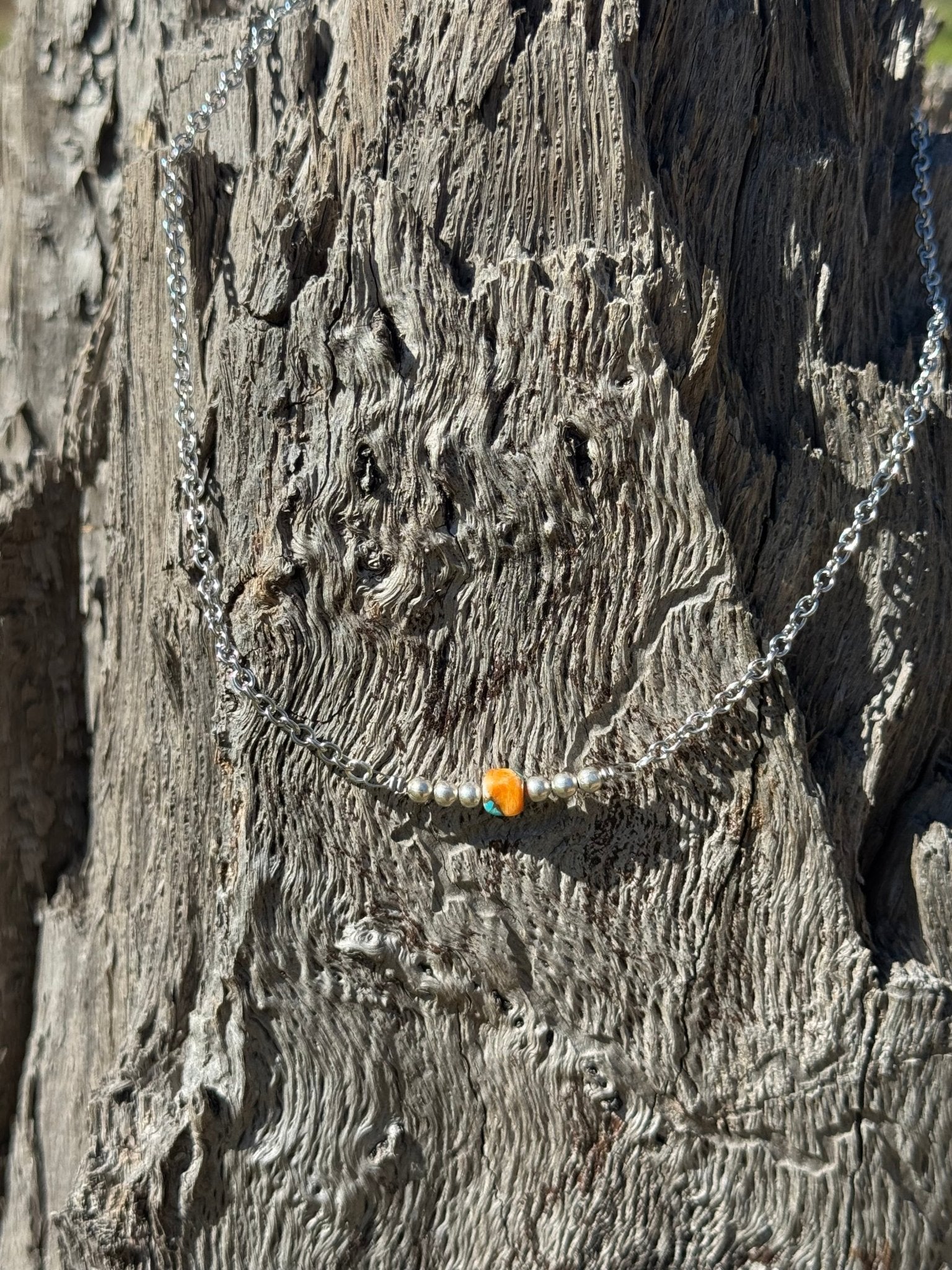 The Authentic Spiny Oyster Cube & Silver Pearls Necklace is a stunning blend of southwestern charm and timeless elegance. Featuring a vibrant spiny oyster cube bead paired with classic silver pearls, this necklace adds the perfect pop of color and texture to any outfit. Whether you're layering it with your favorite turquoise pieces or letting it shine on its own, this piece is made for cowgirls who love a little boldness with their beauty.