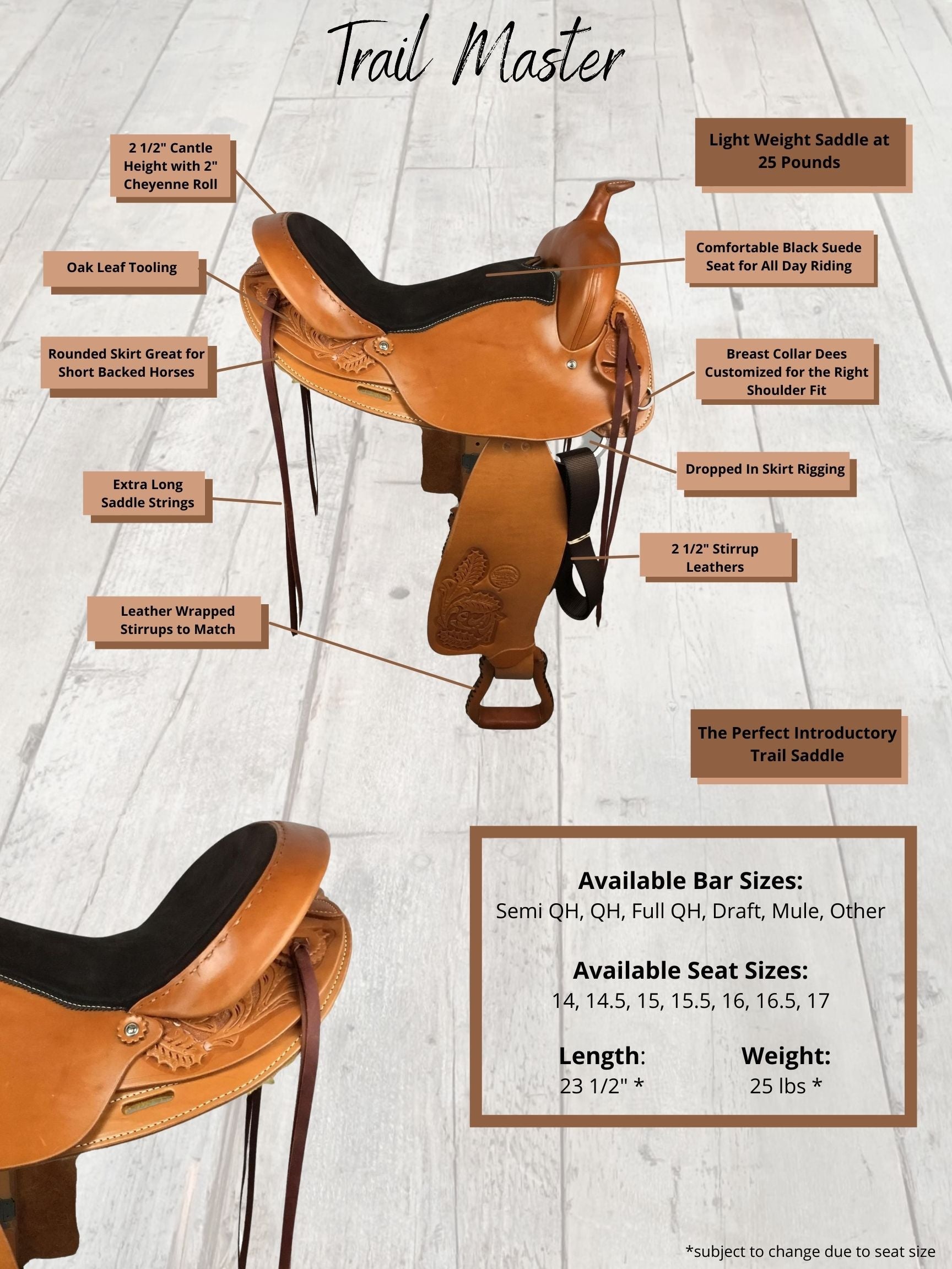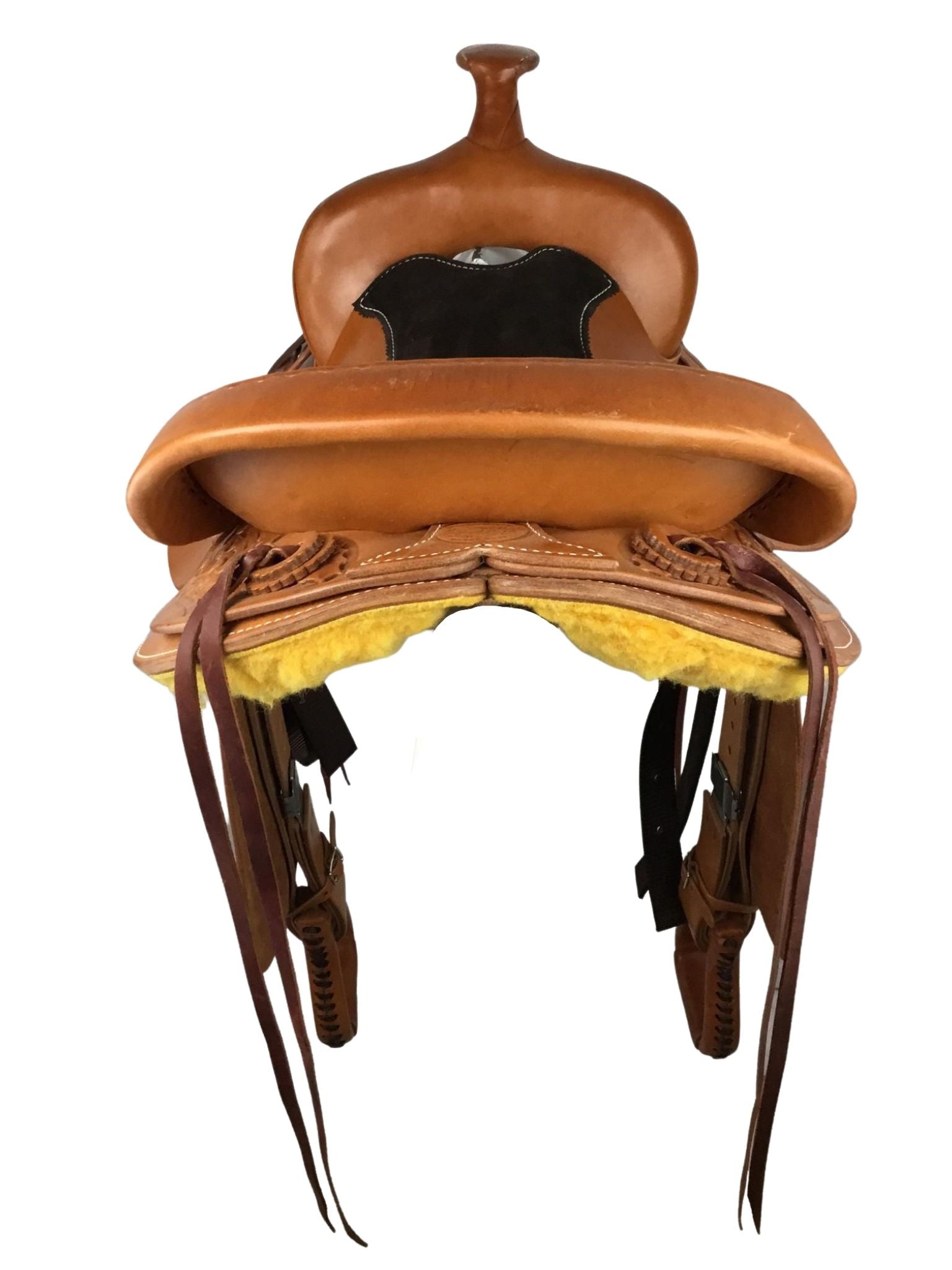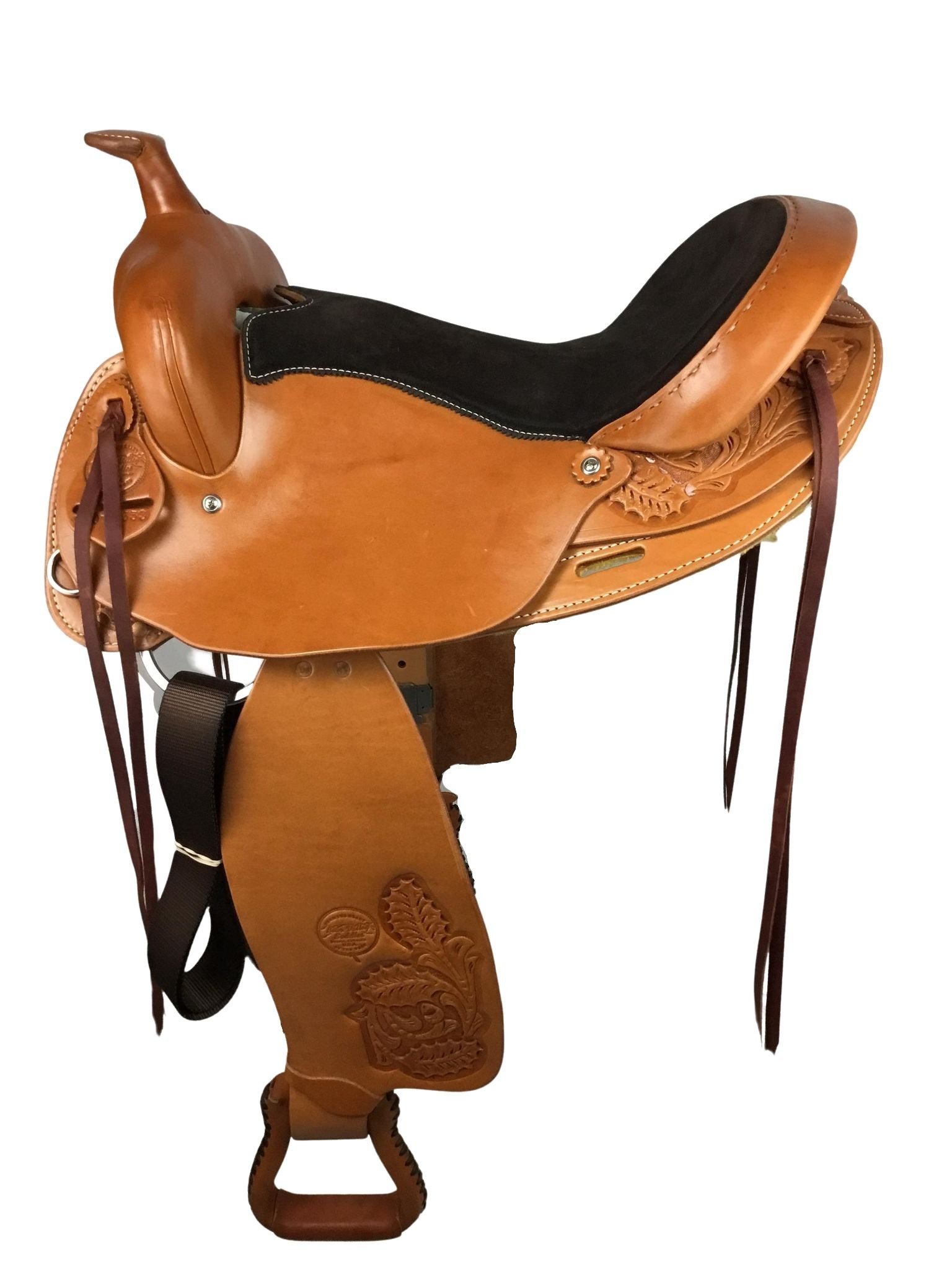 This saddle is made of quality golden leather with a light coat of oil. This saddle has a 2 1/2" cantle with a leather Cheyenne roll, 2 1/2" half stirrup leathers to increase contact with your horse and a Nevada twist in the stirrup leathers to help relieve stress on your knees. This saddle also has a 23 1/2" double rounded skirt, which is perfect with short-backed horses. Flank cinch not included.