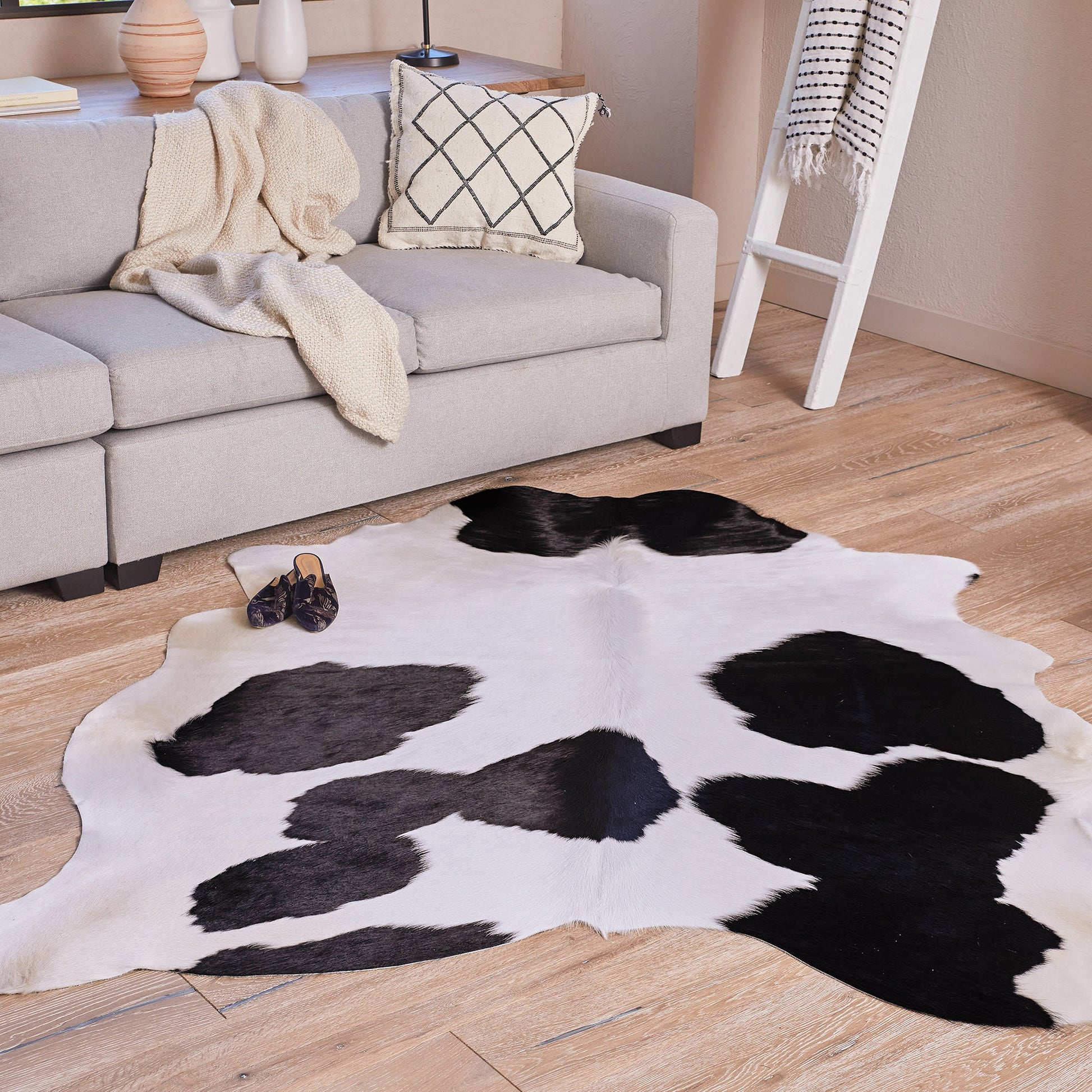 This top of the line grade A natural cowhide is unique in pattern, size and shape. Extremely durable that can last you a lifetime. Match it with this Cowhide Pillow Black and White for more elegance.