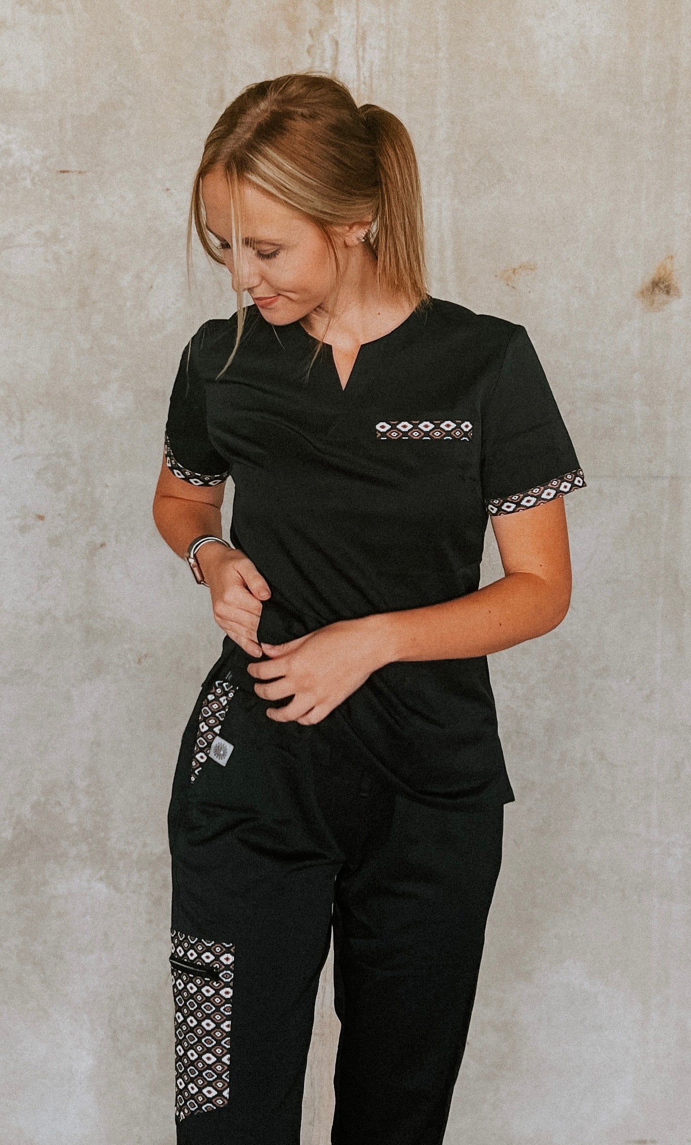 Jogger styled pants, made of a polyester/spandex blend. Drawstring ties, front and back pockets, and an open top/zipper closed pocket on the lower leg! Joggers are fitted and it is recommended to size up if between.