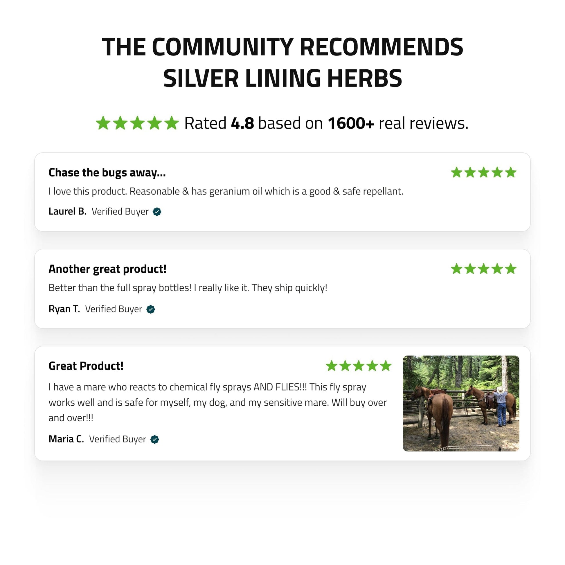 Bug Repel is a concentrated blend of essential oils that smell great, and are effective at repelling insects. Use around the house, on yourself, or on your horses and pets to keep away everything from flies to ticks.