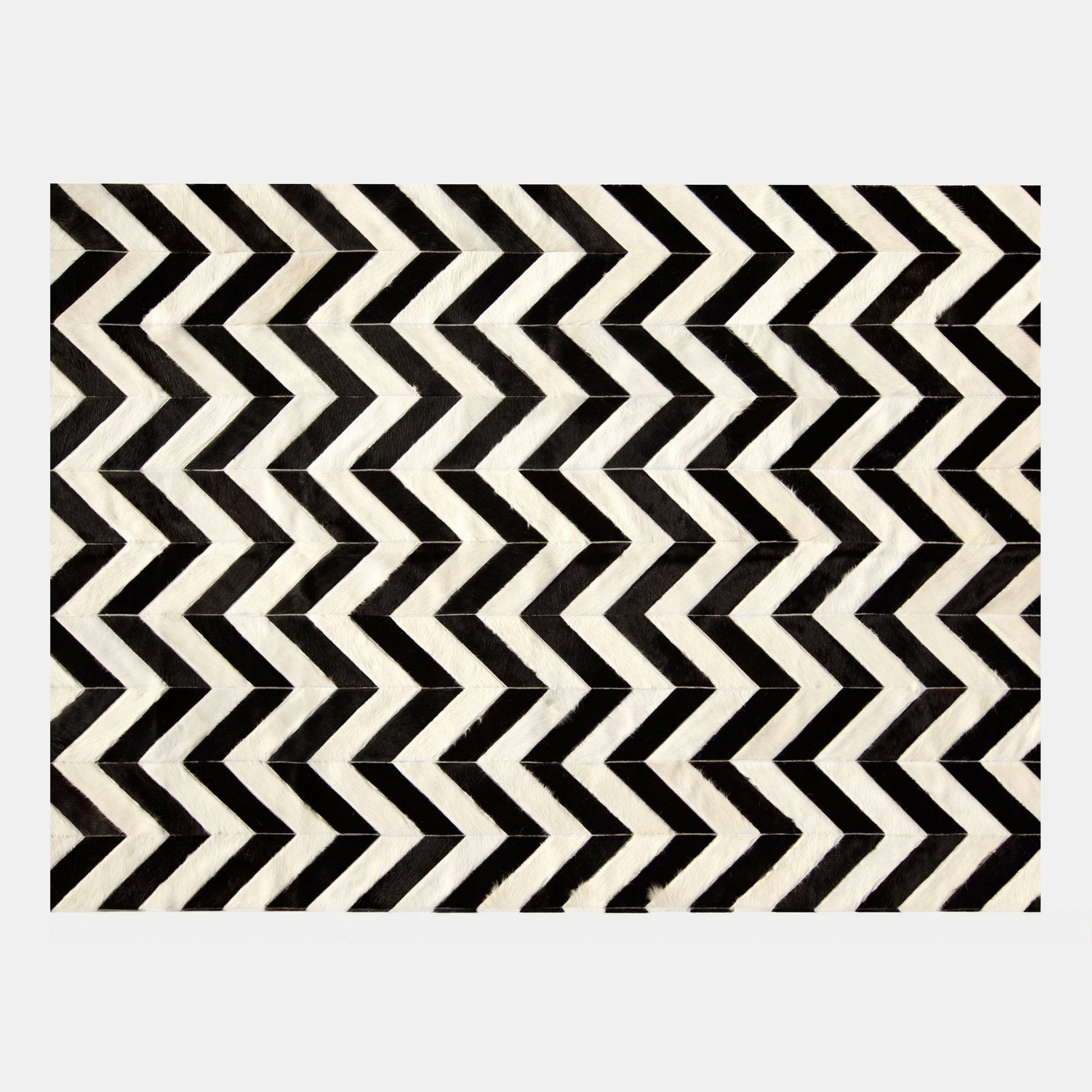 Turn heads with the striking herringbone pattern of our Capri Cowhide Rug. Featuring a bold black-and-white waving design, this rug adds a contemporary edge and visual intrigue to any room. Each piece is meticulously selected and cut for its color to ensure it harmonizes perfectly with the surrounding pieces, creating a balanced color pattern throughout the rug exclusive to eCowhides. The geometric lines create a dynamic focal point that seamlessly integrates modern style with classic elegance.