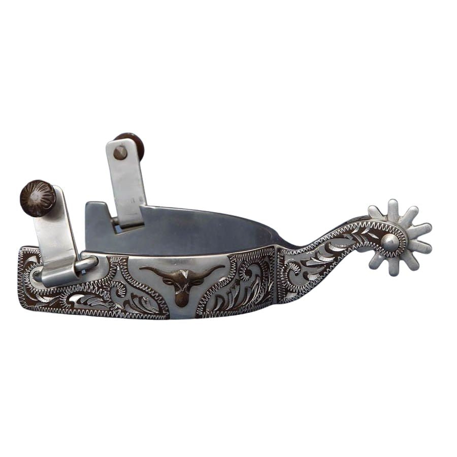 A beautiful stainless steel spur with antique brown overlays that have bright cuts to give them a special and unique look. 1" band, 1" ten point rowels and 2 1/4" shank. Antique Brown buttons.