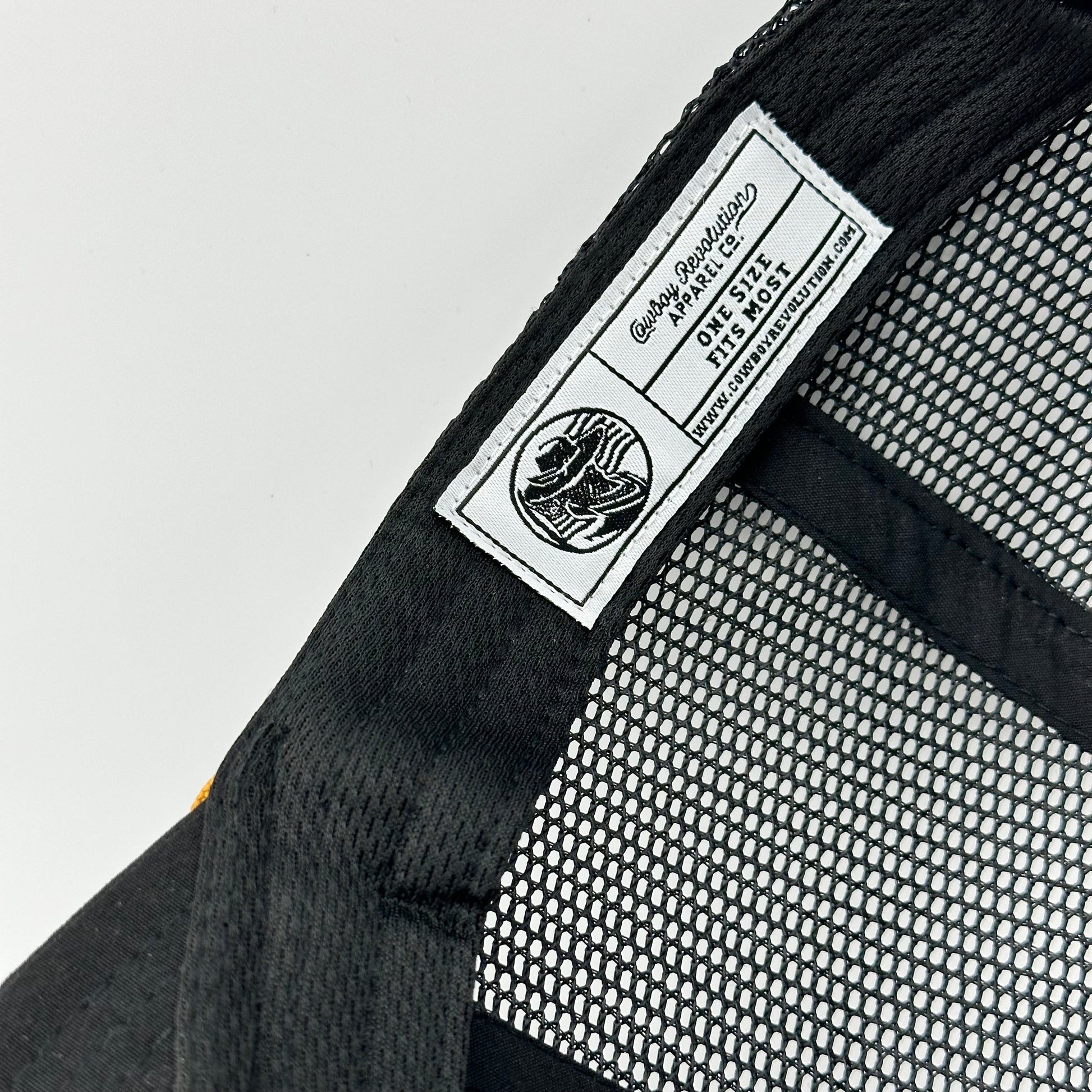 Introducing the Black "Cowboy Hat" Trucker Patch Hat by Cowboy Revolution Apparel Co., a stylish and versatile accessory for all occasions.