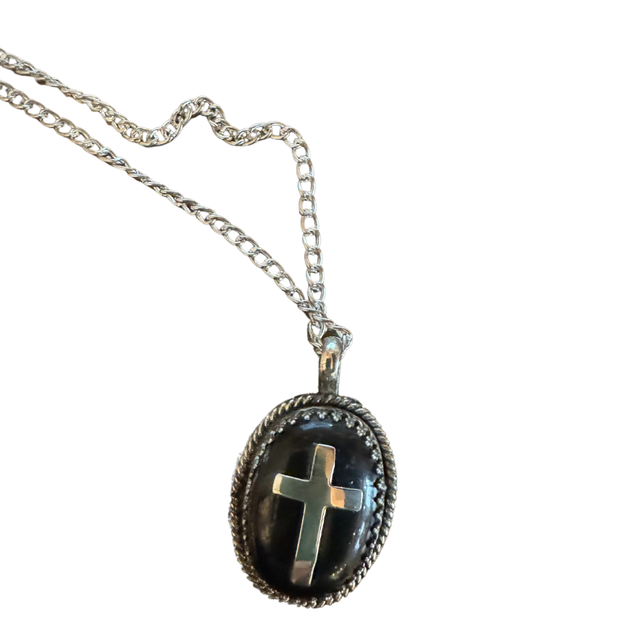Elevate your style with this stunning Cross Jewelry Set! This unique set features a bold black onyx stone with a beautifully detailed sterling silver cross embellishment. Each piece is custom hand-made, making them truly one of a kind. Complete with a 24" chain, this set is not only stylish, but also a meaningful addition to any outfit.