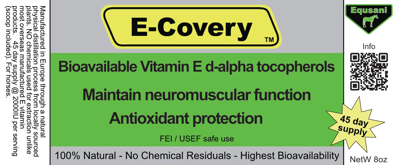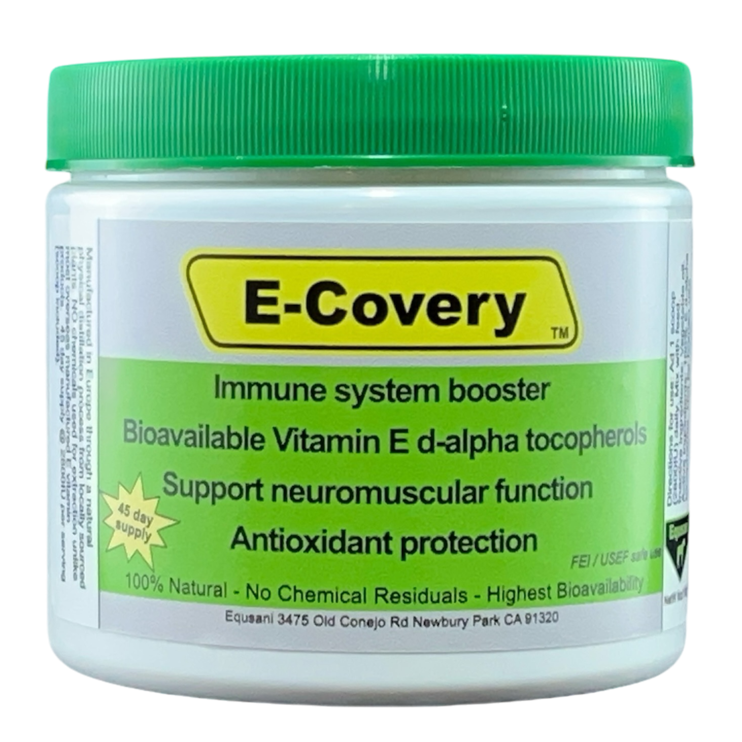 E-Covery™ is a 100% natural vitamin E supplement for horses, formulated to support muscle recovery, nerve health, and antioxidant defense. Using d-alpha-tocopherol—the most bioavailable form of vitamin E—E-Covery stands out due to its physical distillation process and premium ingredient quality, ensuring superior purity and stability.