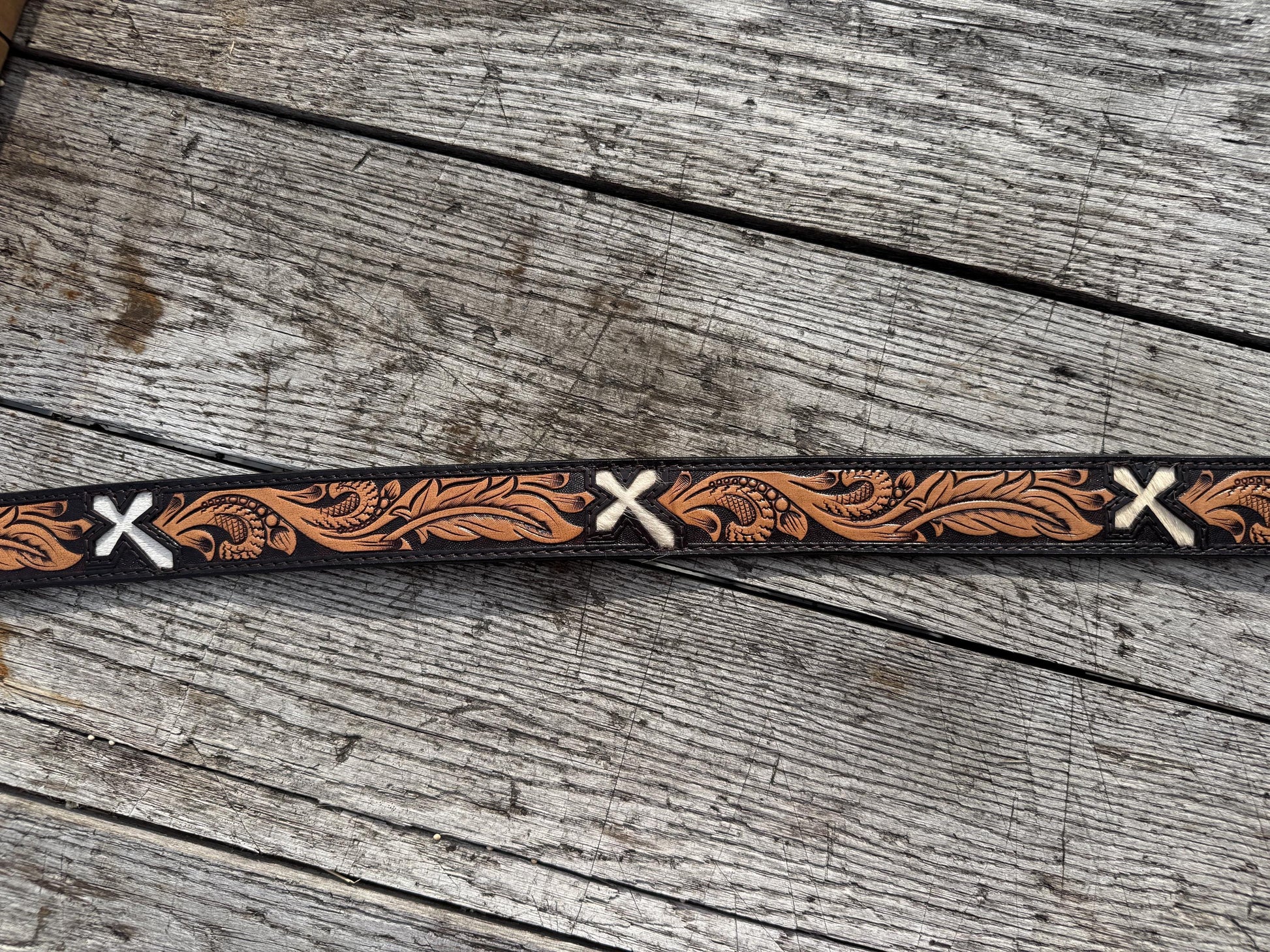 Belt Features: Genuine Leather, Black and Tan Tooled details, Cross cut outs with cowhide, Antique silver buckle. Buckle is removable.