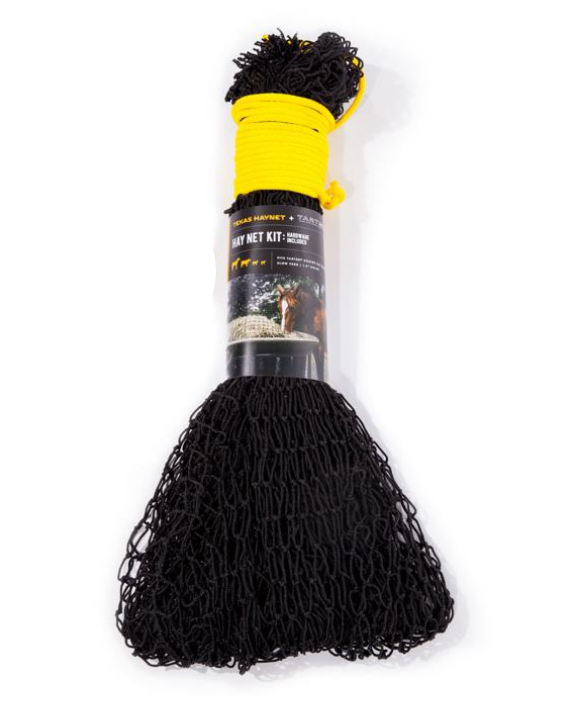 Tarter Equine Hay Basket sold separately. You can create the safest, healthiest, most cost effective square bale feeder on the market by pairing our slow feed hay net kit with a Tarter Equine Hay Basket (pictured and sold separately). The Texas Haynet slows consumption and helps prevent colic, ulcers, and founder. The Equine Hay Basket keeps hay dry and off the ground while allowing horses to eat in their natural position with their head down.