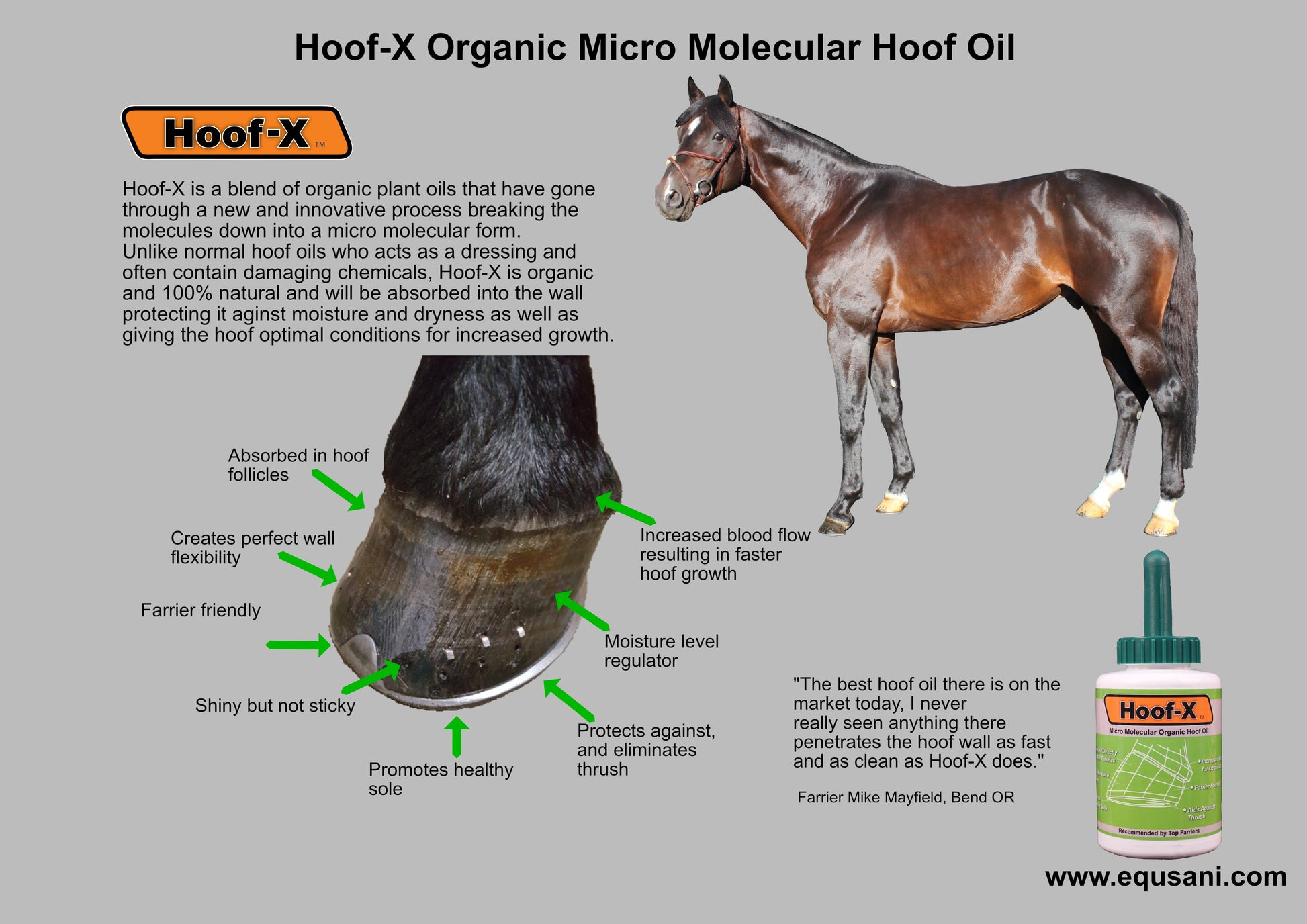 Hoof-X™ is an all-natural hoof care oil designed to support moisture balance, elasticity, and overall hoof health. Made with a blend of natural plant oils and Vitamin E, Hoof-X features a micro-molecular formula that allows for quick absorption into the hoof wall follicles—providing extended protection and supporting healthy hoof function from the inside out.