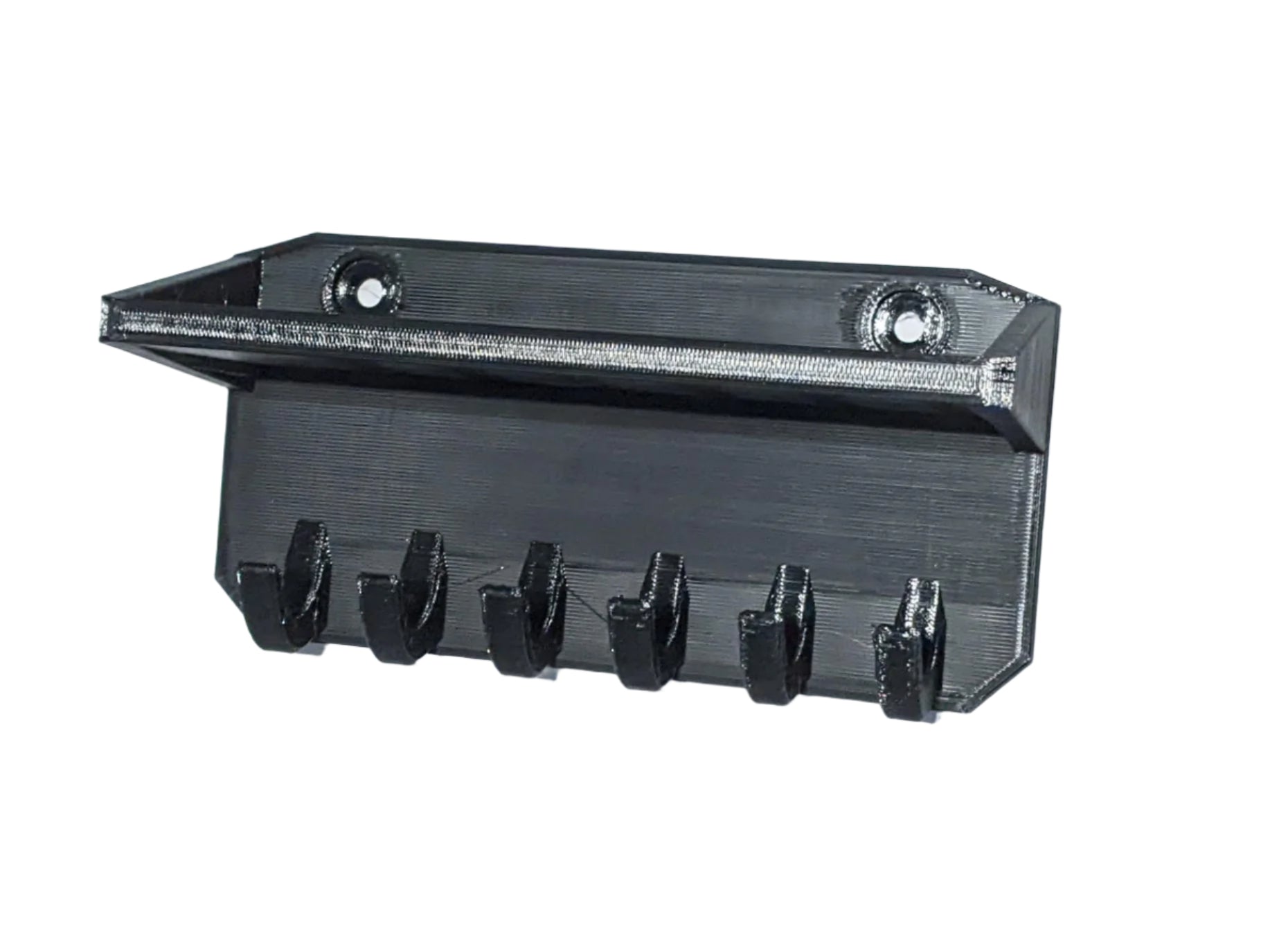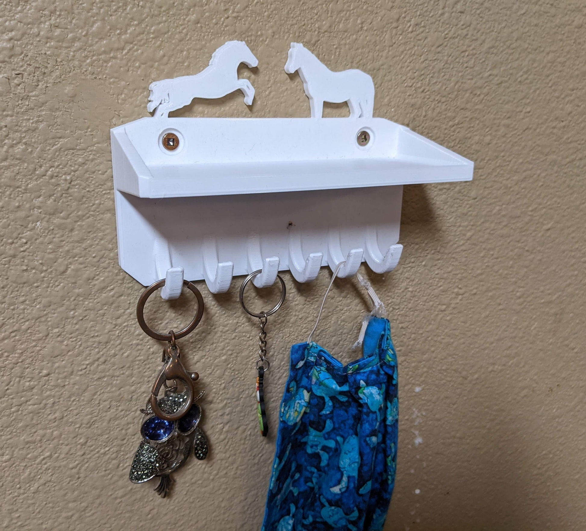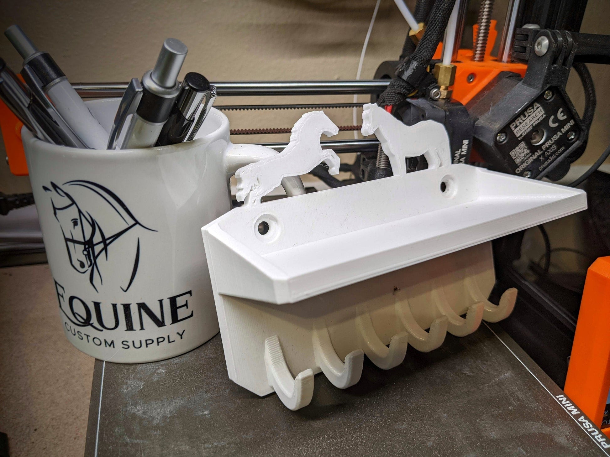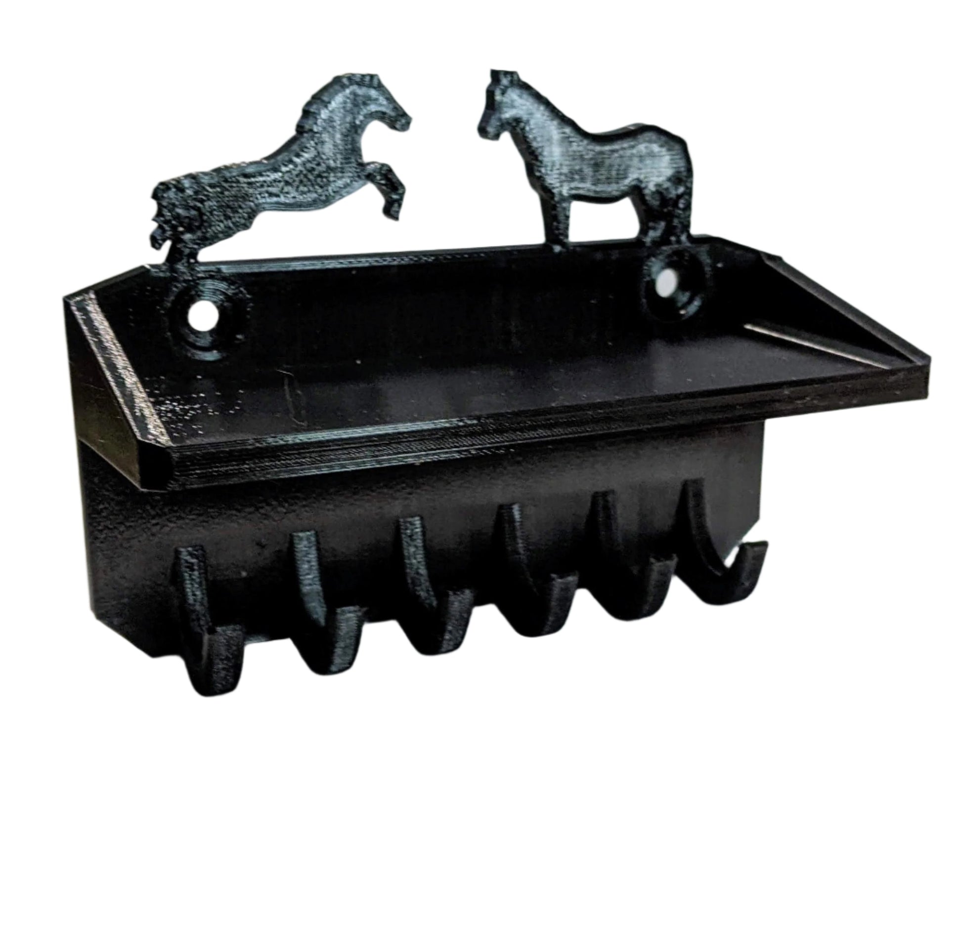 A 3D printed key hanger to add a touch of your equestrian life to your entry way. Designed with 6 hooks to hang your keys, masks, glasses, key chains, and more but also a 2 inch deep shelf to hold any coins, wallet, or other items all in one easy to grab place which has a small front lip to prevent items from falling off.