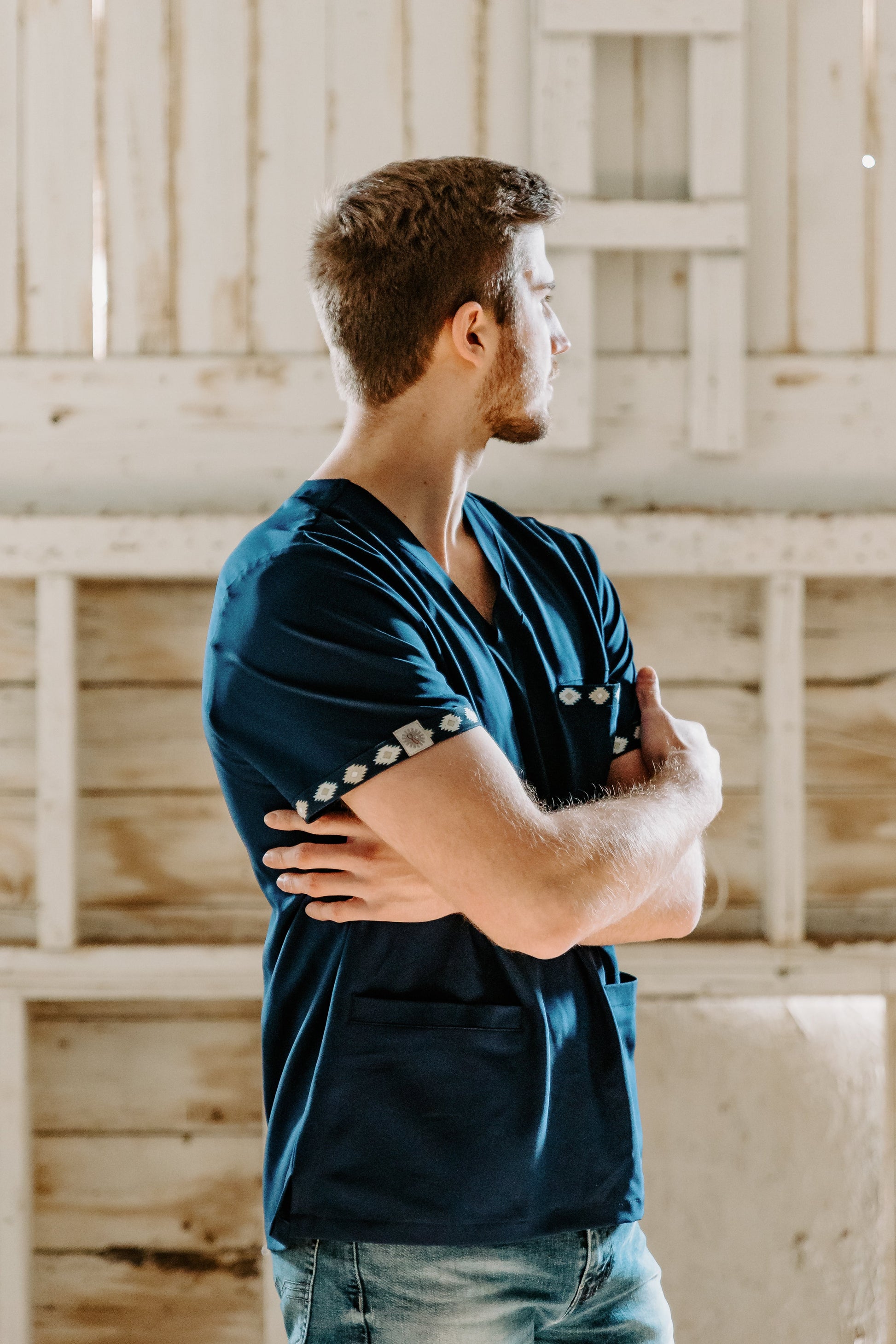 Tops include two lower front pockets, one upper chest pocket, and right-shoulder badge reel clip attachment.
