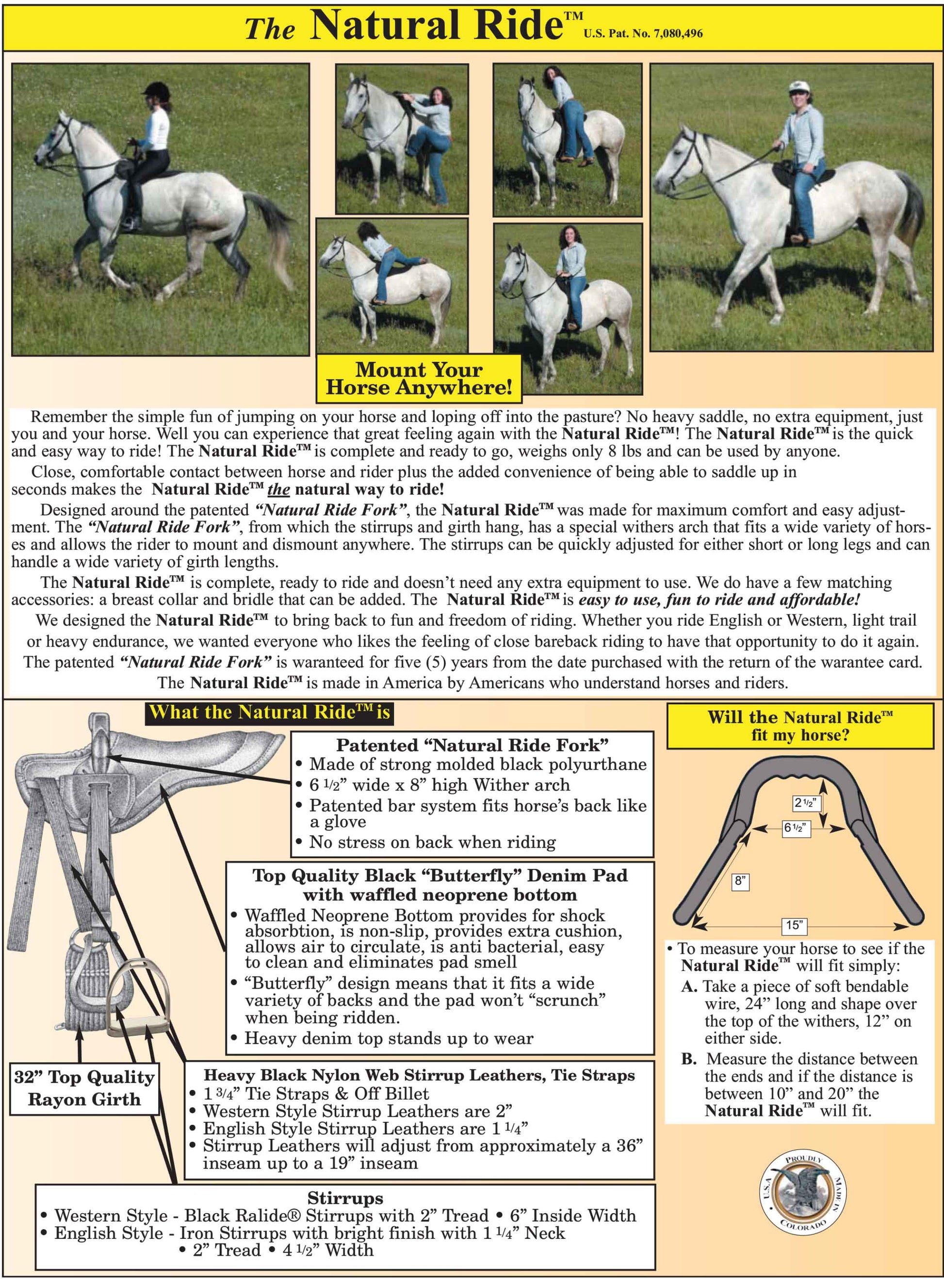 Remember the simple fun of jumping on your horse and loping off into the pasture? No heavy saddle, no extra equipment, just you and your horse. Well you can experience that great feeling again with the Natural Ride™! The Natural Ride™ is the quick and easy way to ride! The Natural Ride™ is complete and ready to go, weighs only 8 lbs and can be used by anyone. Pat. No. 7,080,496