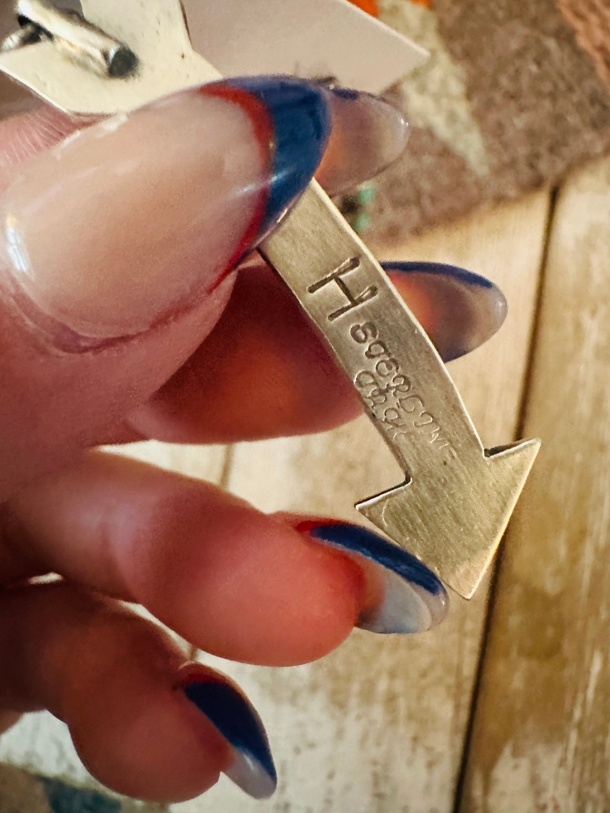 These are a beautiful pair of Handcrafted Sterling Silver and Turquoise arrow dangle earrings. These measure 2 3/8 inches long and 1/2 of an inch wide. Amazing craftsmanship! Stamped Sterling and signed by the artist.