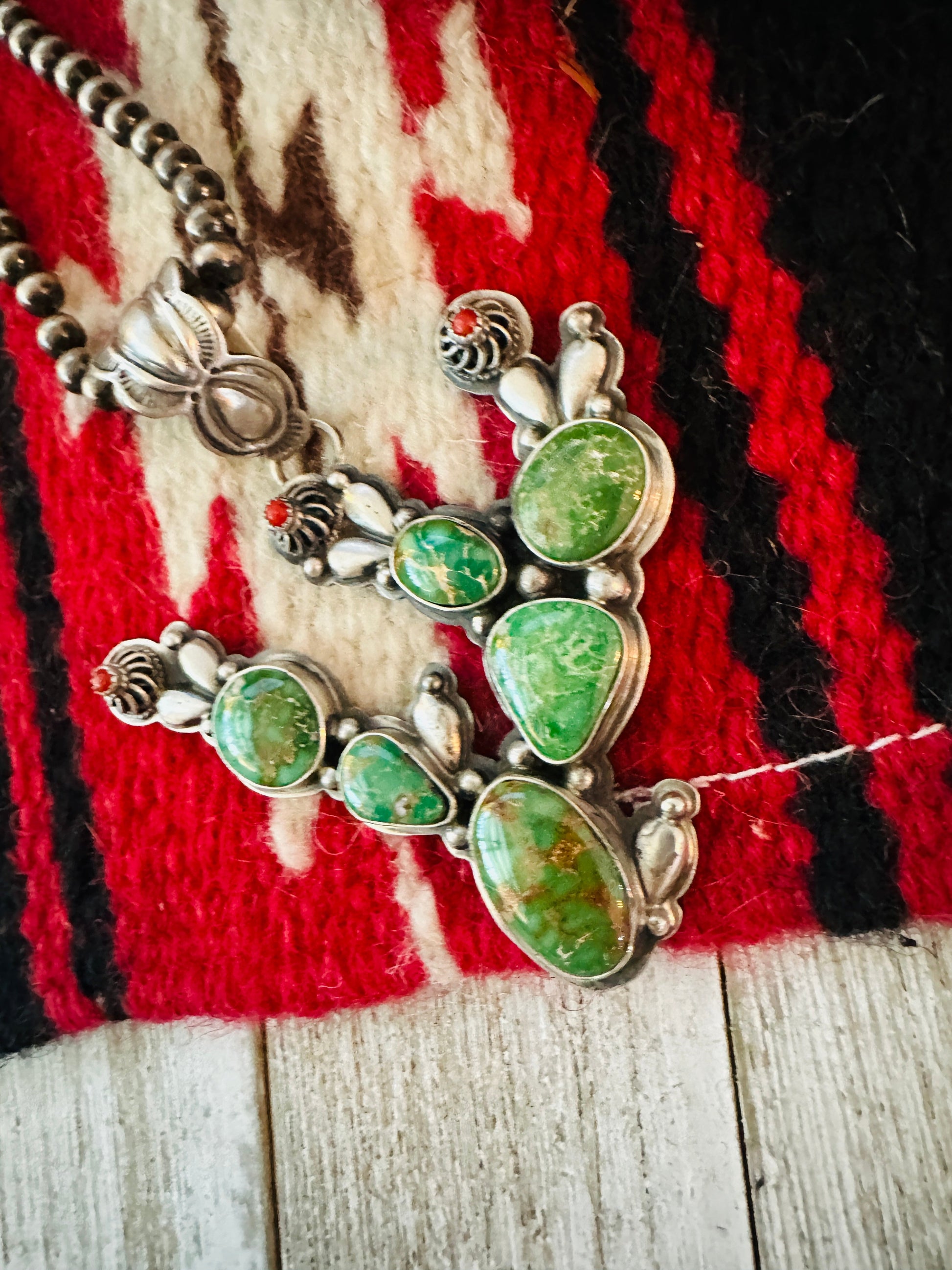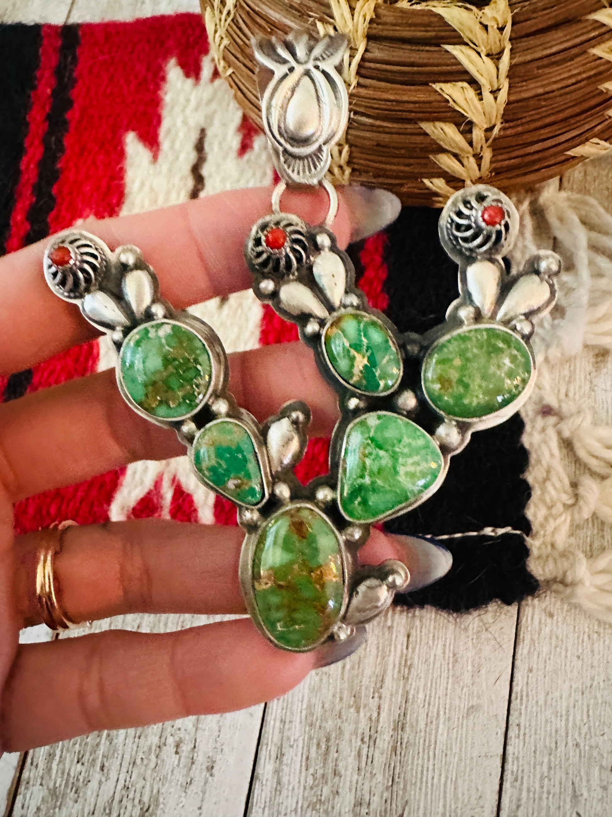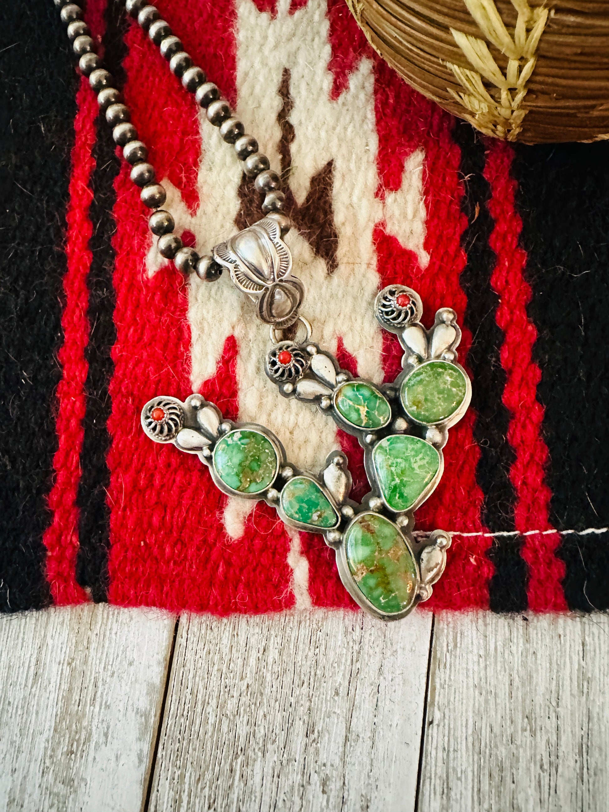 Handcrafted Turquoise, Coral and Sterling Silver Cactus Pendant by Charles Johnson