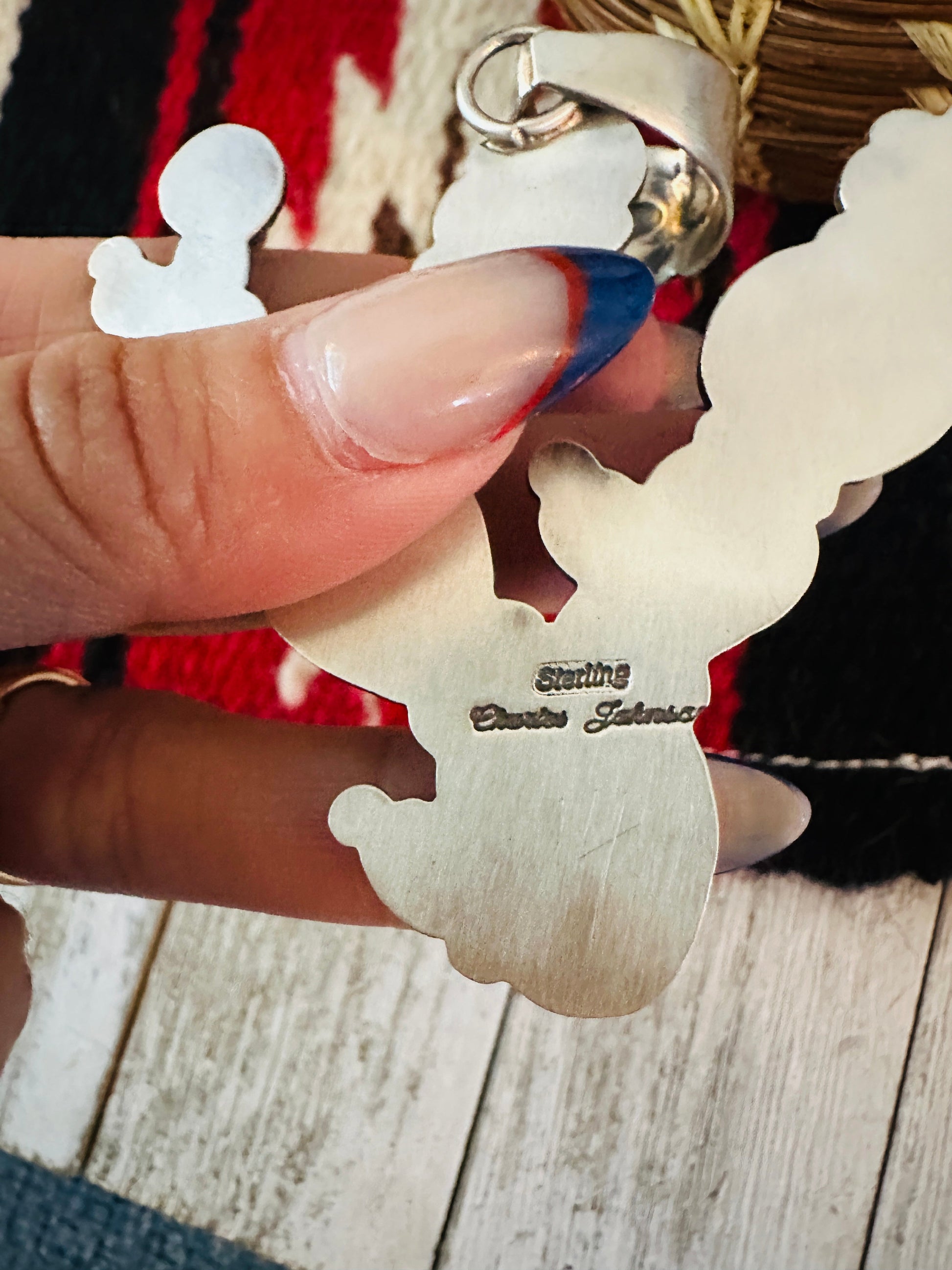 Awesome Turquoise, Coral and Sterling Silver Cactus Pendant. Absolutely beautiful craftsmanship! Pendant measures 3 1/2 inches long and 3 inches wide. Bale measures just over 1/2 of an inch across. Signed by the artist Charles Johnson and stamped Sterling. Pendant Only.