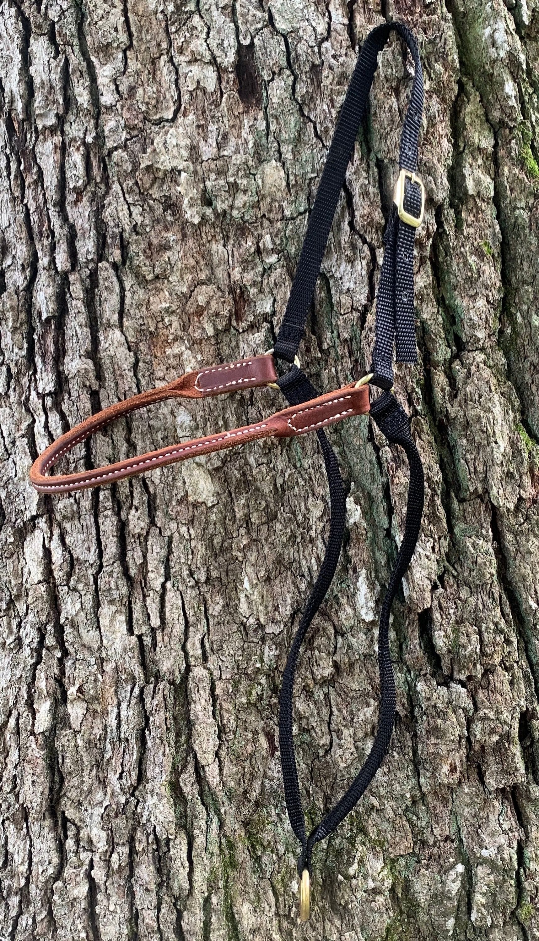 Nylon Bonnet with the rolled leather front. It is adjustable across the poll with solid brass hardware to prevent rusting and make for long-term use.