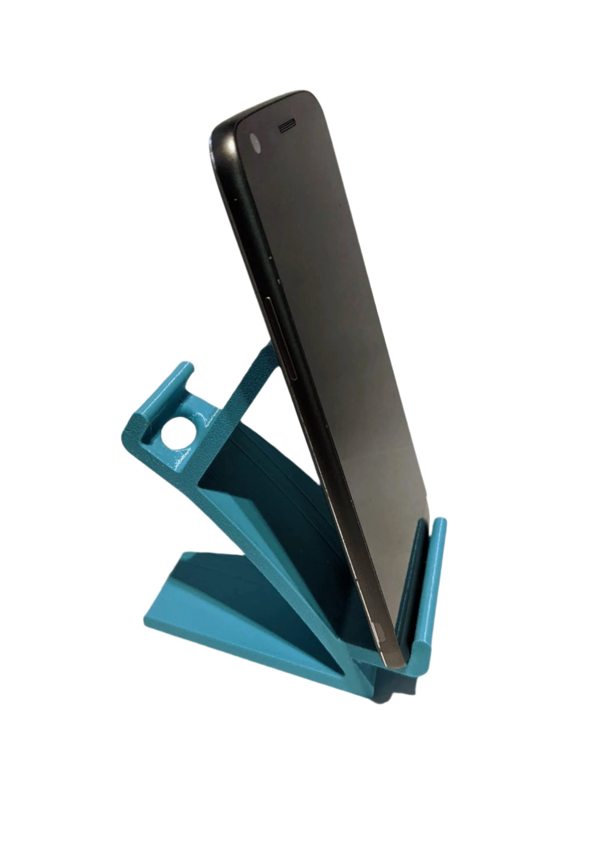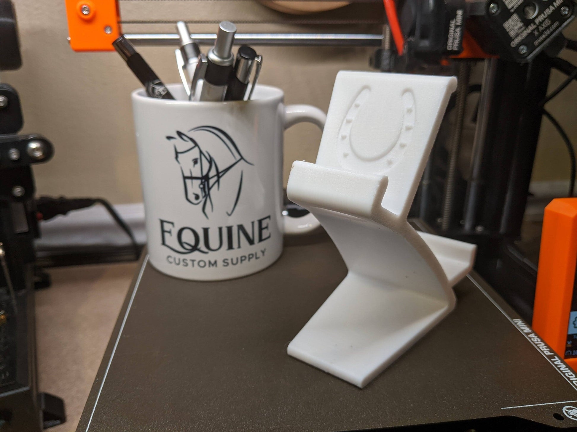 A different style of 3d printed phone and tablet stand that allows for multiple viewing angles, portrait or landscape, and the upper mount allows for the charger to be plugged in. The upper mount allows for devices up to 15mm/0.6" thick that will fit most phones in a moderate case with the special touch of a debossed horseshoe, and the lower mount allows for up devices up to 22mm/0.85" thick. Most tablets and larger phones and phone cases will fit.