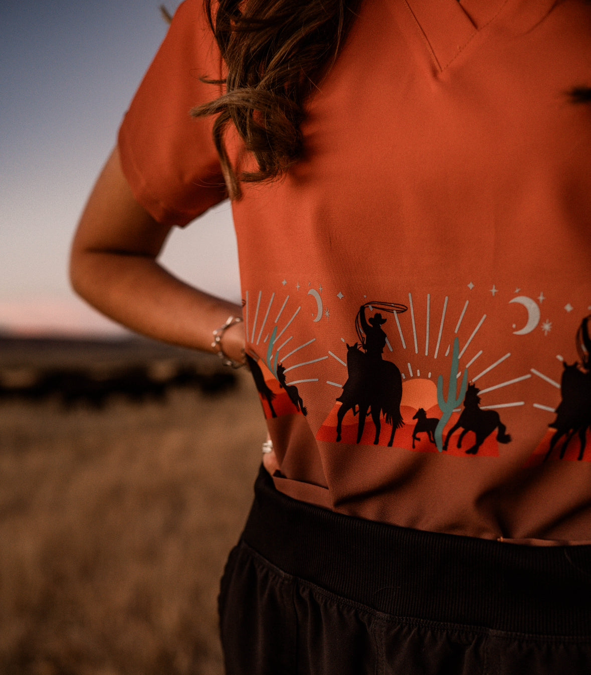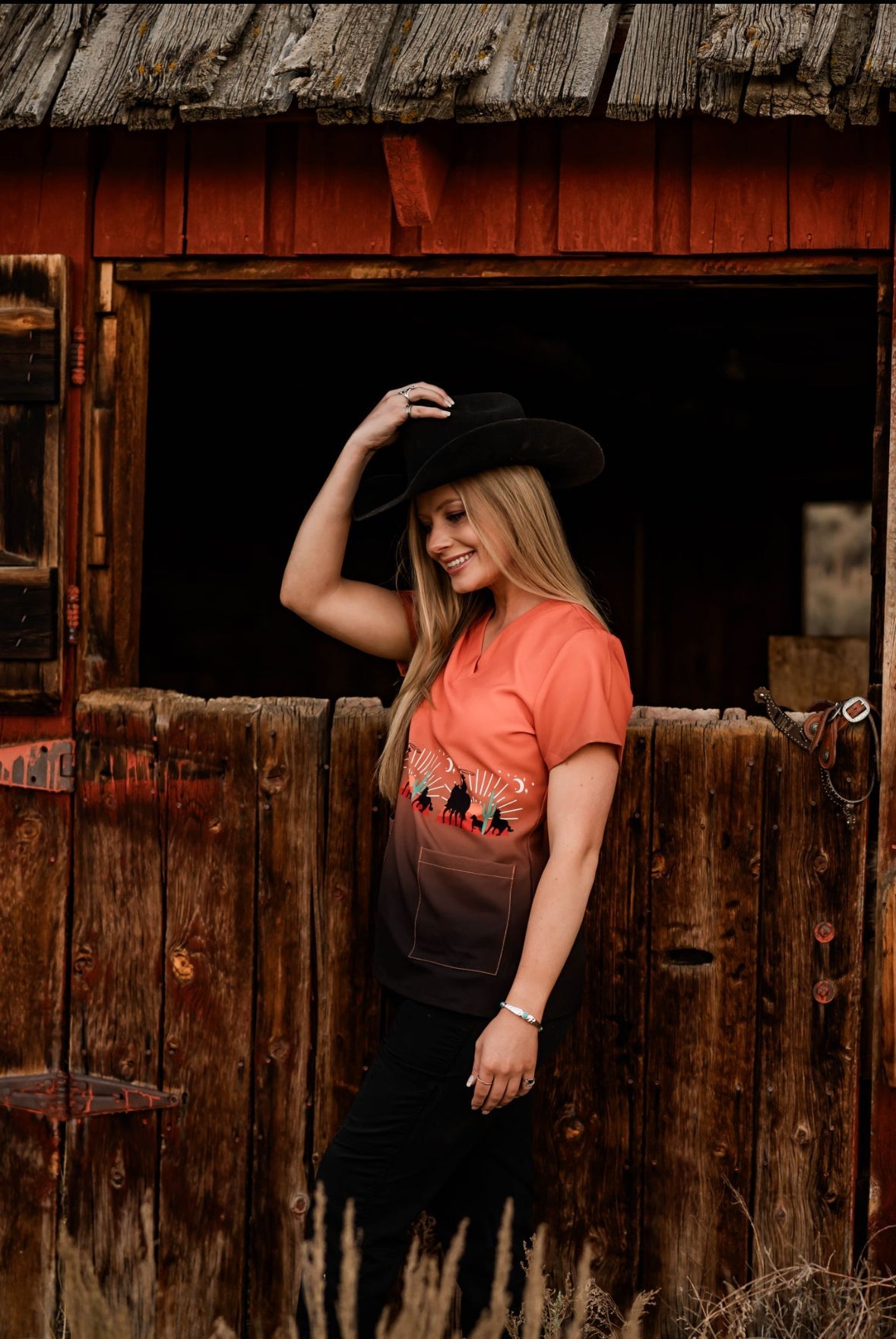 Ride right into the sunset yourself wearing this one of a kind seamless ombre top! Wear it straight into your night or on-call night shift knowing that you have REFLECTIVE elements accompanying you. That's right, the sunbeams, moon, and stars of the design will shine as bright as your confidence levels while wearing it. The ombre hits at the perfect level to be worn tucked in or tucked out for two different style feels!