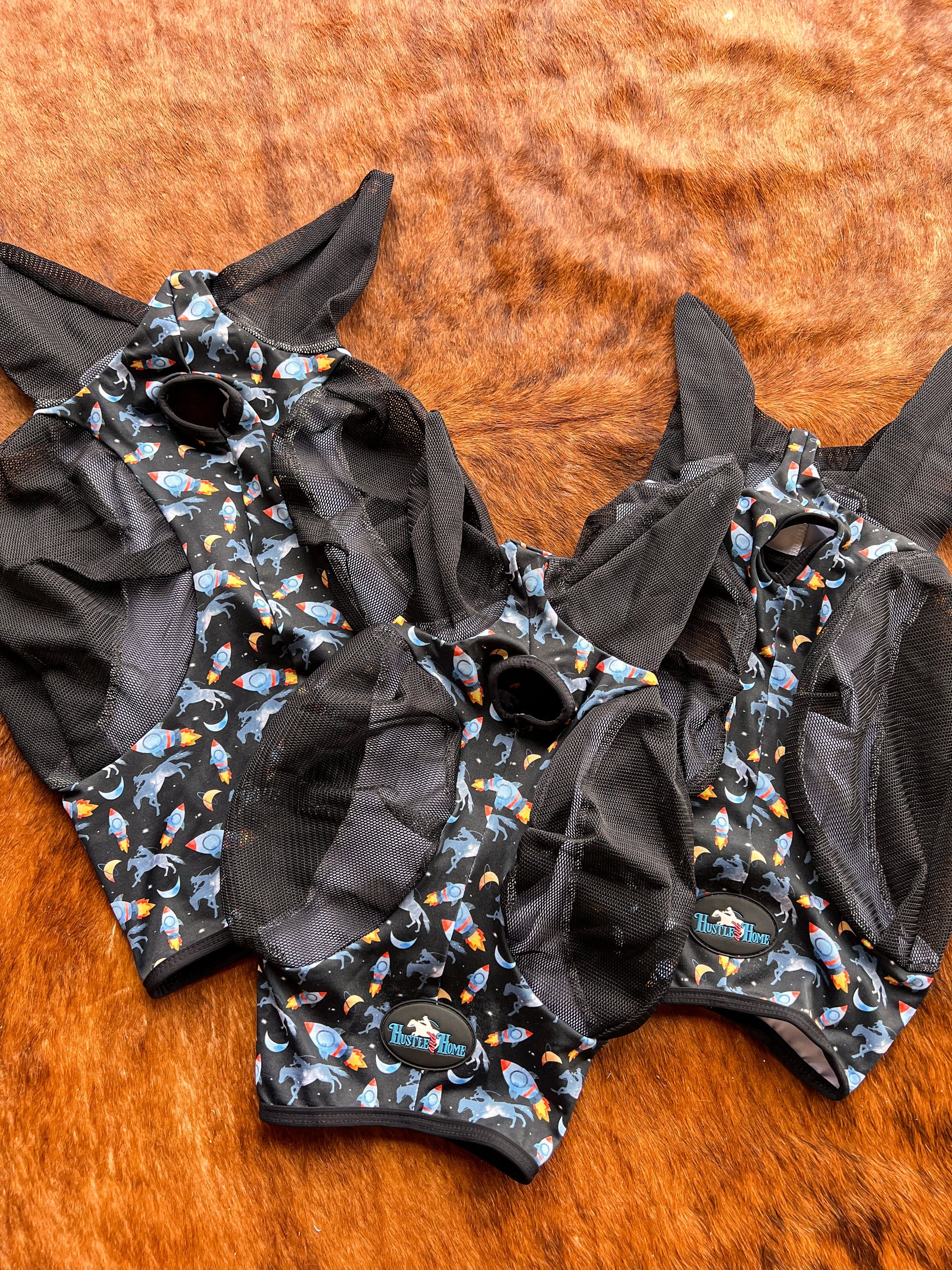 •pull on style fly mask in exclusive Hustle and Home Rocket Donkey design