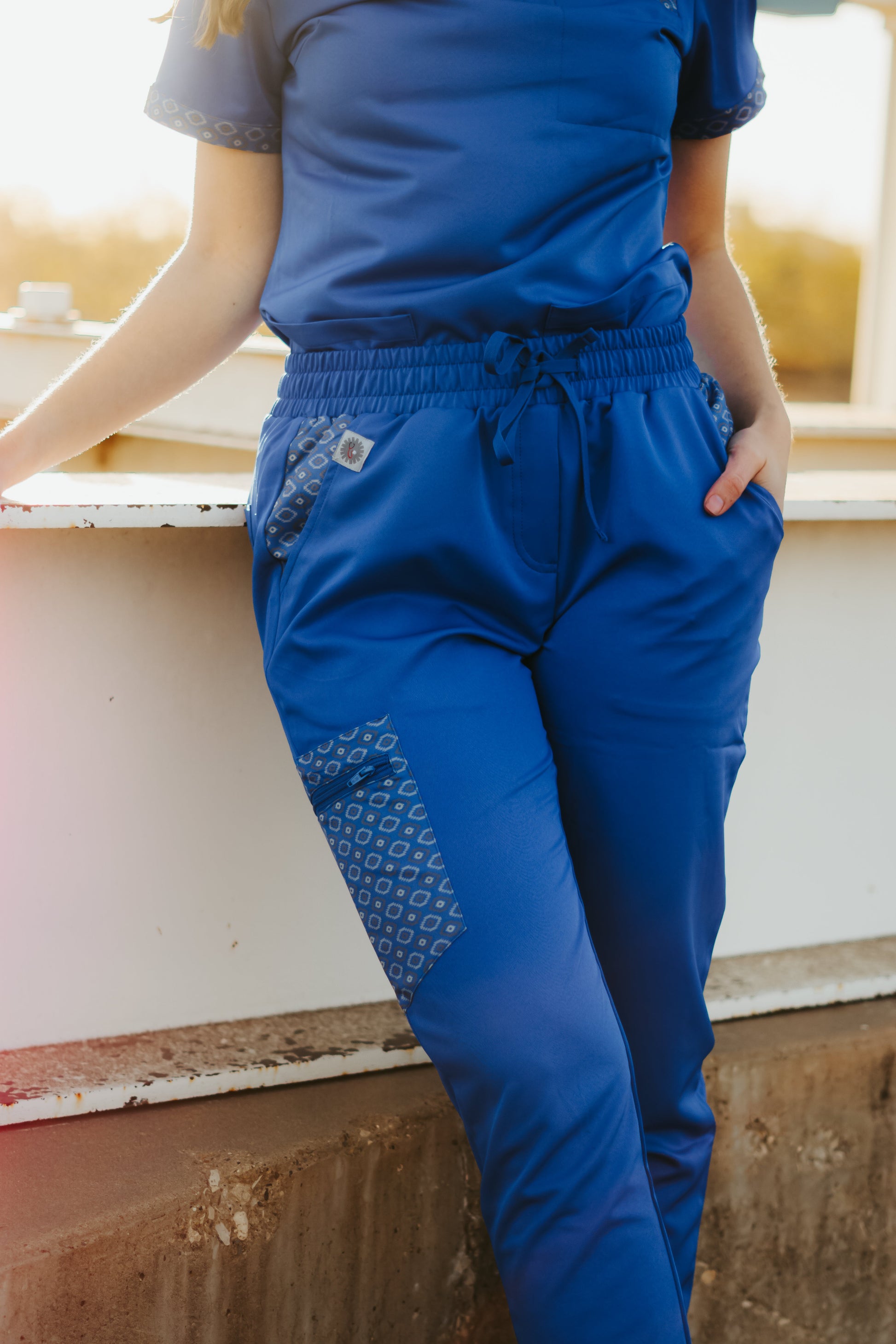 Jogger styled pants, made of a polyester/spandex blend. Drawstring ties, front and back pockets, and a zipper closed pocket on the lower leg! Joggers are fitted and it is recommended to size up if between.