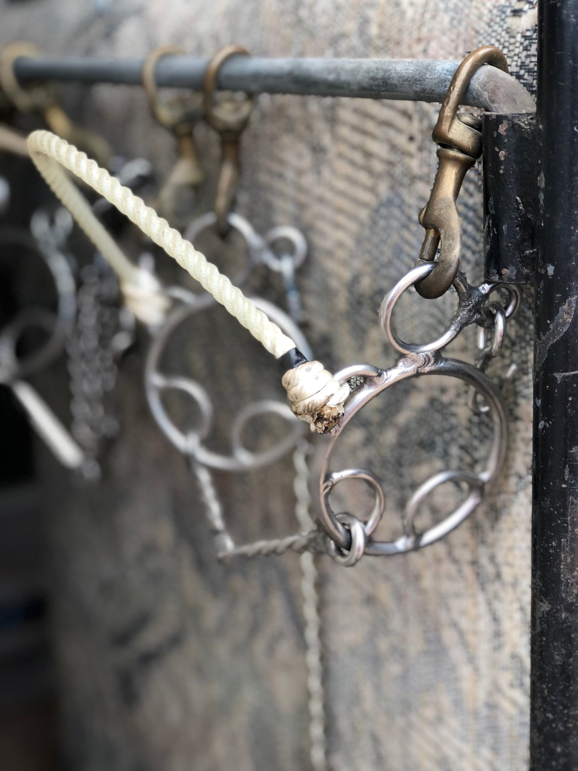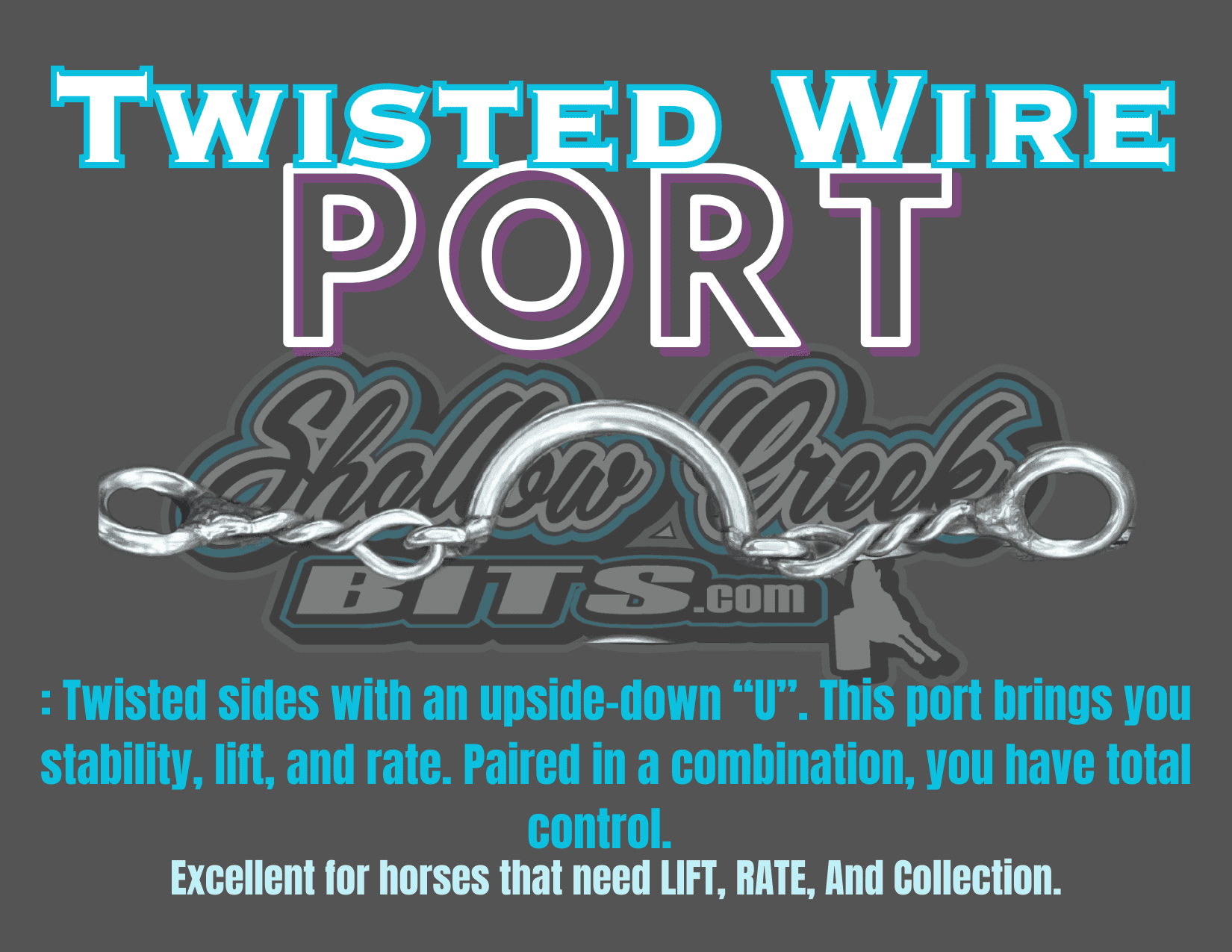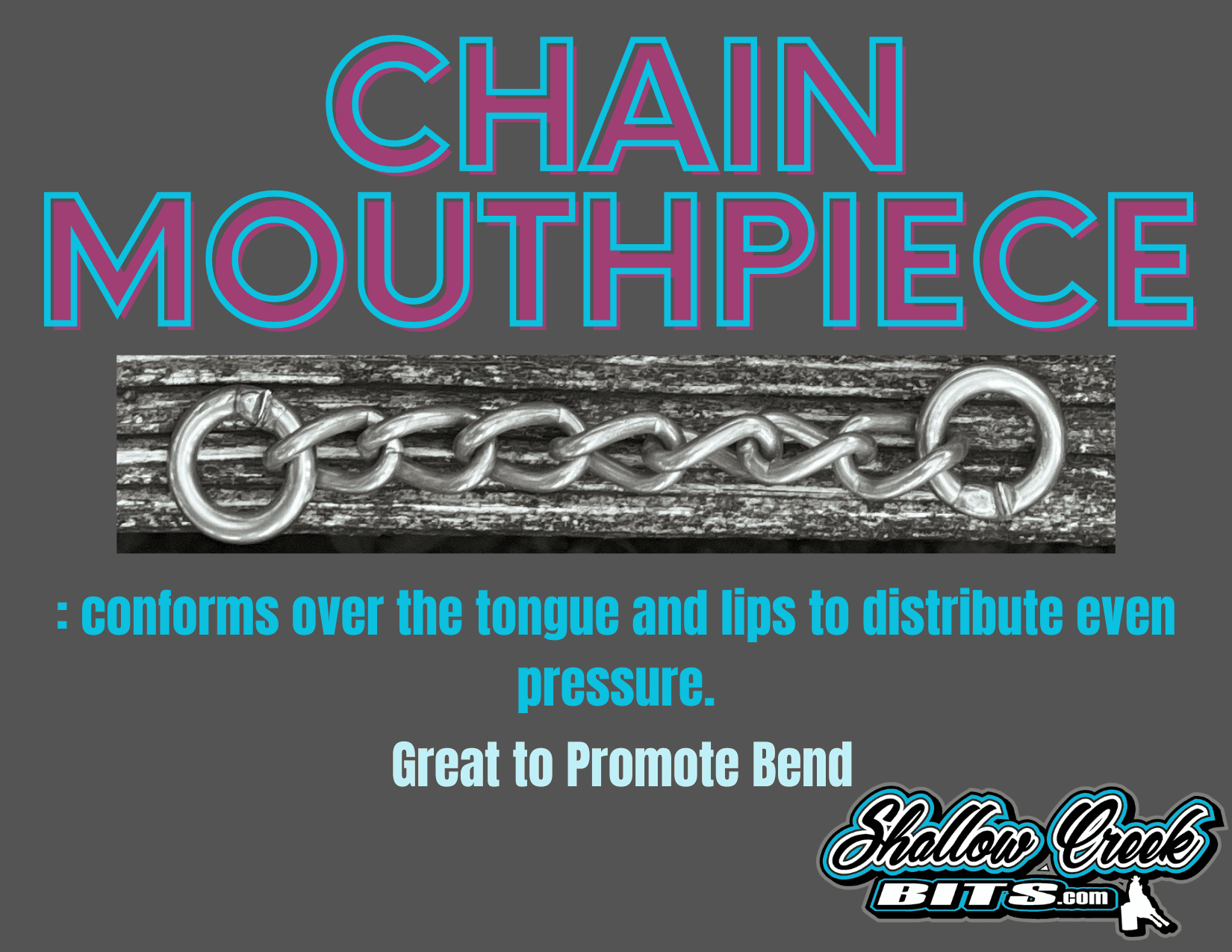 2.5” Ring with locked mouthpiece, rein ring, and drop curb. The headstall ring doesn't allow this combination to roll around on the ring. This bit is light but incredibly effective in providing support and balance as you increase with speed. This bit will square one up in the shoulders and help give a cue to finish the turns tight while adding speed.