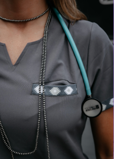Tops include two lower front pockets, one upper chest pocket, and right-shoulder badge reel clip attachment.