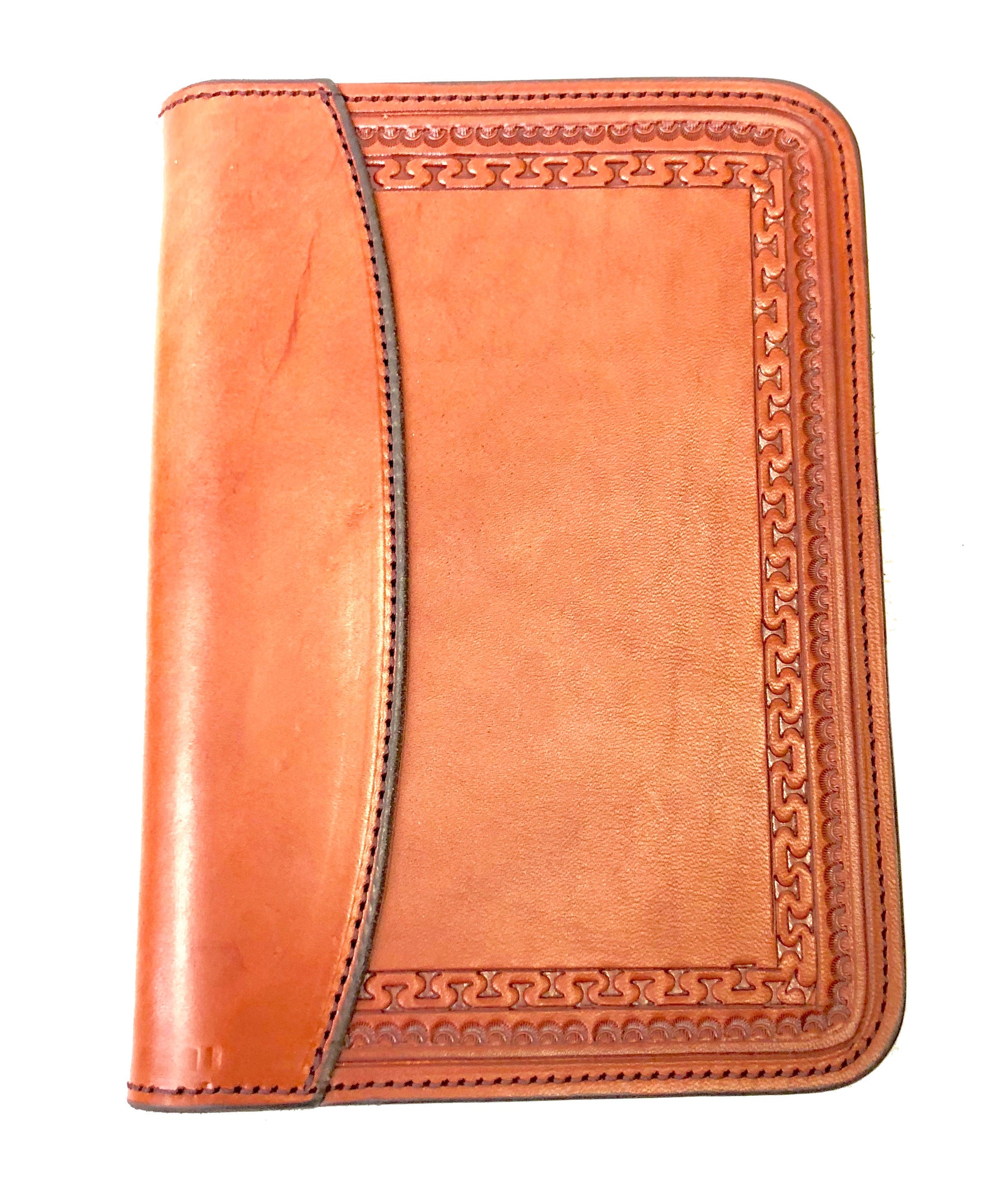 The Colorado Saddlery small notebook cover is a beautiful way to protect books or notebooks. These attractive handmade covers are made out of sturdy, genuine saddle leather and fit notebooks nicely. The inside of the cover has pockets for cards, notes, and writing utensils. The sides have page holders.
