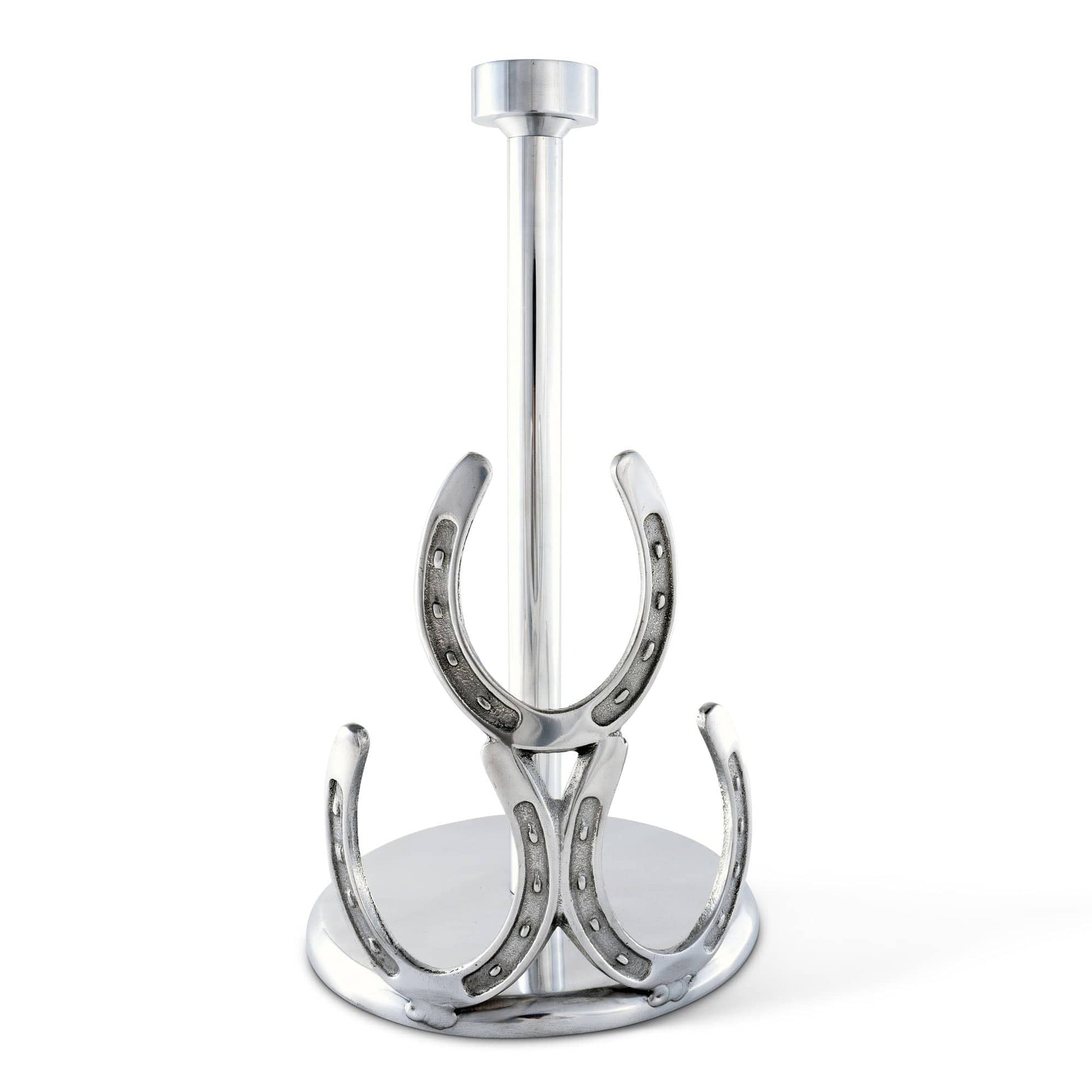 Handcrafted in Arthur Court's signature aluminum, this piece features a long, thick bar extending up from the circular base to support the towels, while a horseshoe stands on its toe next to the pole. Realistic nail markings display inside curved pockets on either side of this design, which looks exceptionally distinguished against the smooth, lustrous surfaces around it.