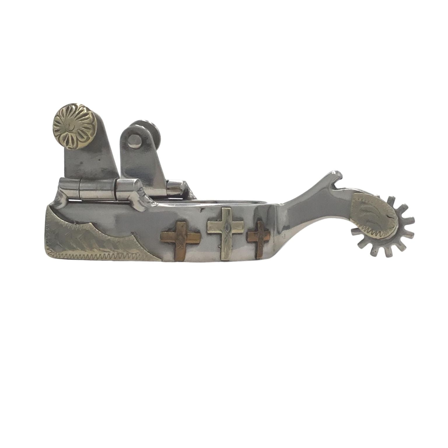 A stainless steel youth spur with a 3/4" band with 3 brass crosses and nickel silver overlay. 1 1/2" shank, 3/4" twelve point rowels and swinging buttons.