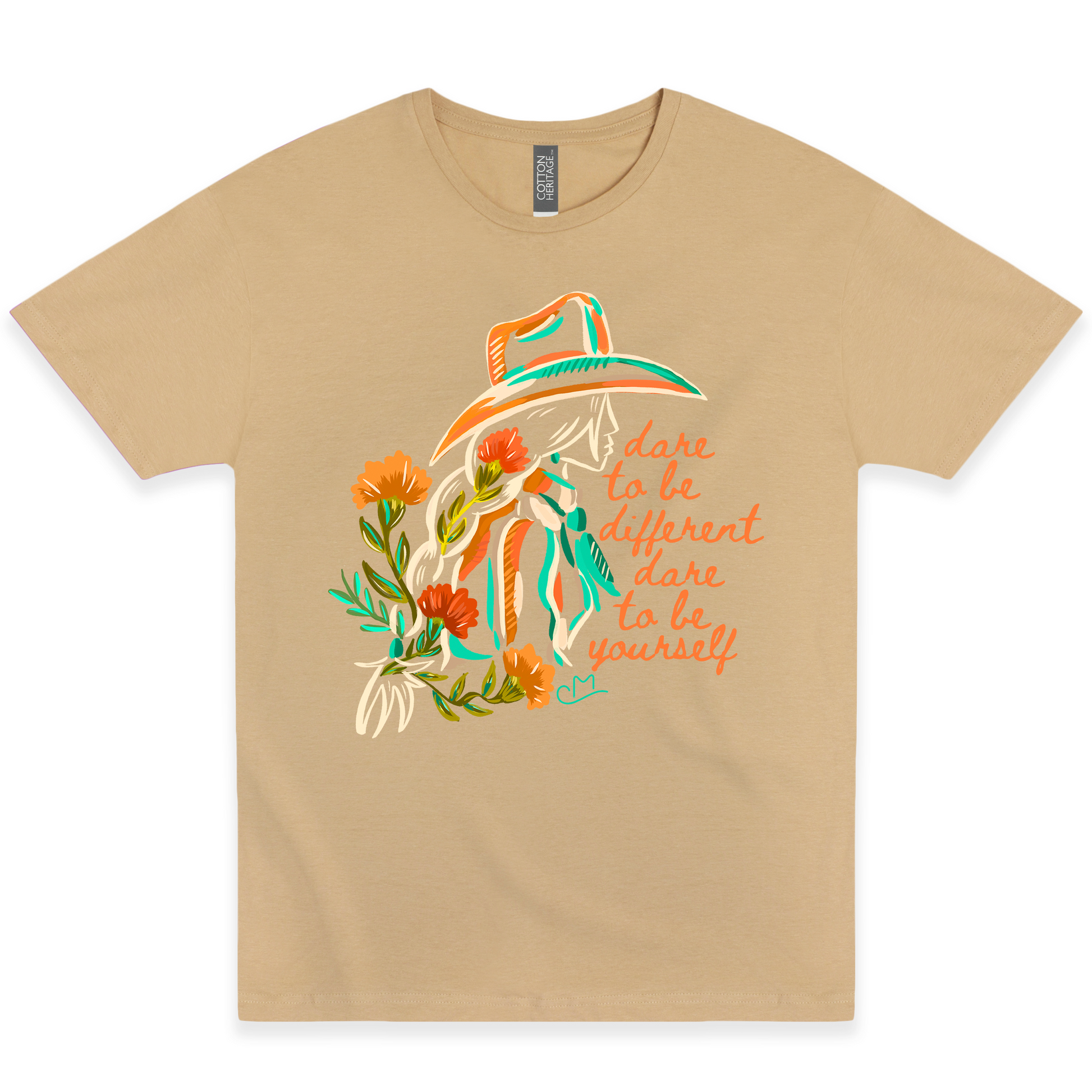 Bold, floral, and full of cowgirl spirit. This women’s fit tee features a hand-drawn design that reminds you to dare to be different and dare to be yourself. Soft, comfy, and made to stand out—just like you.