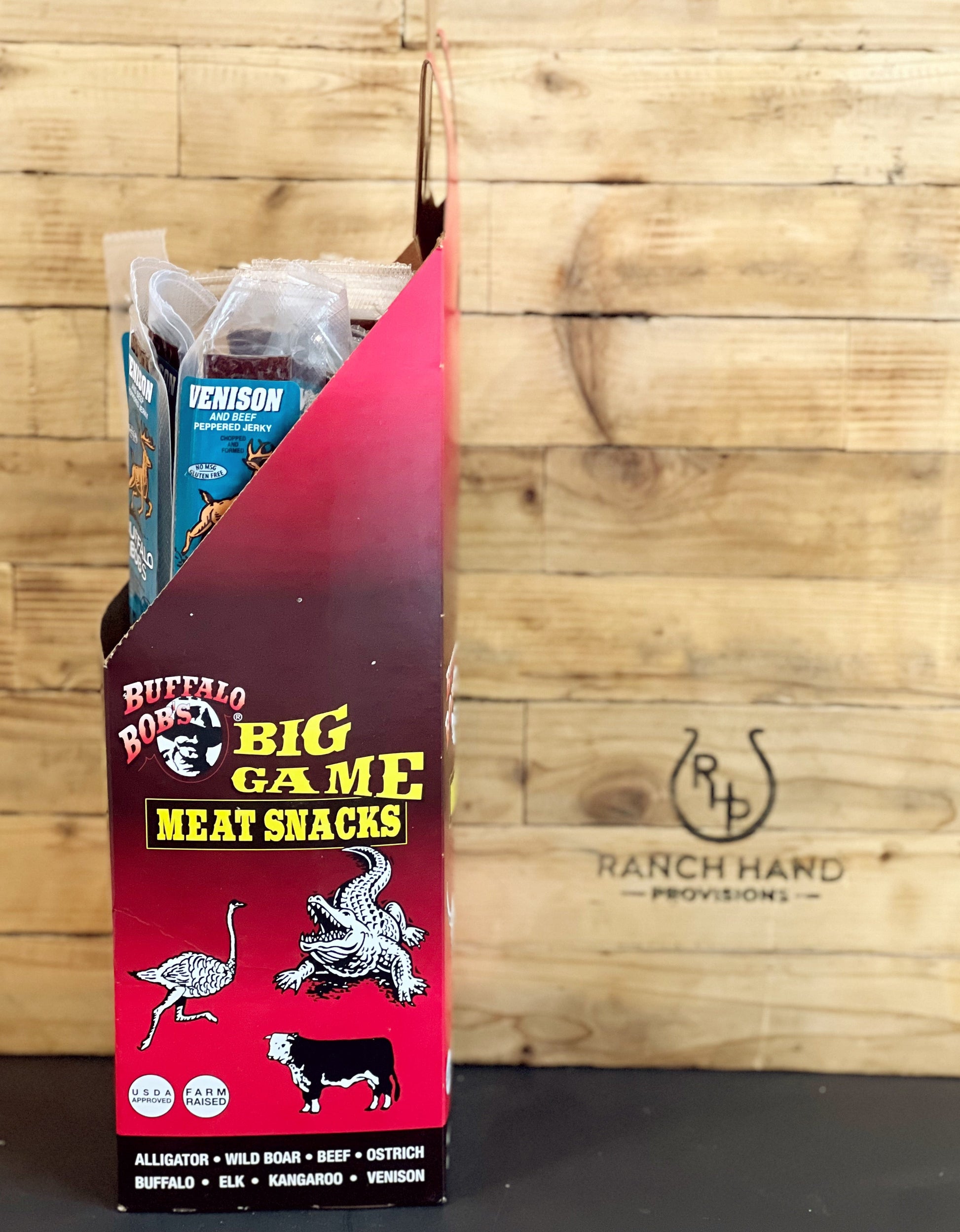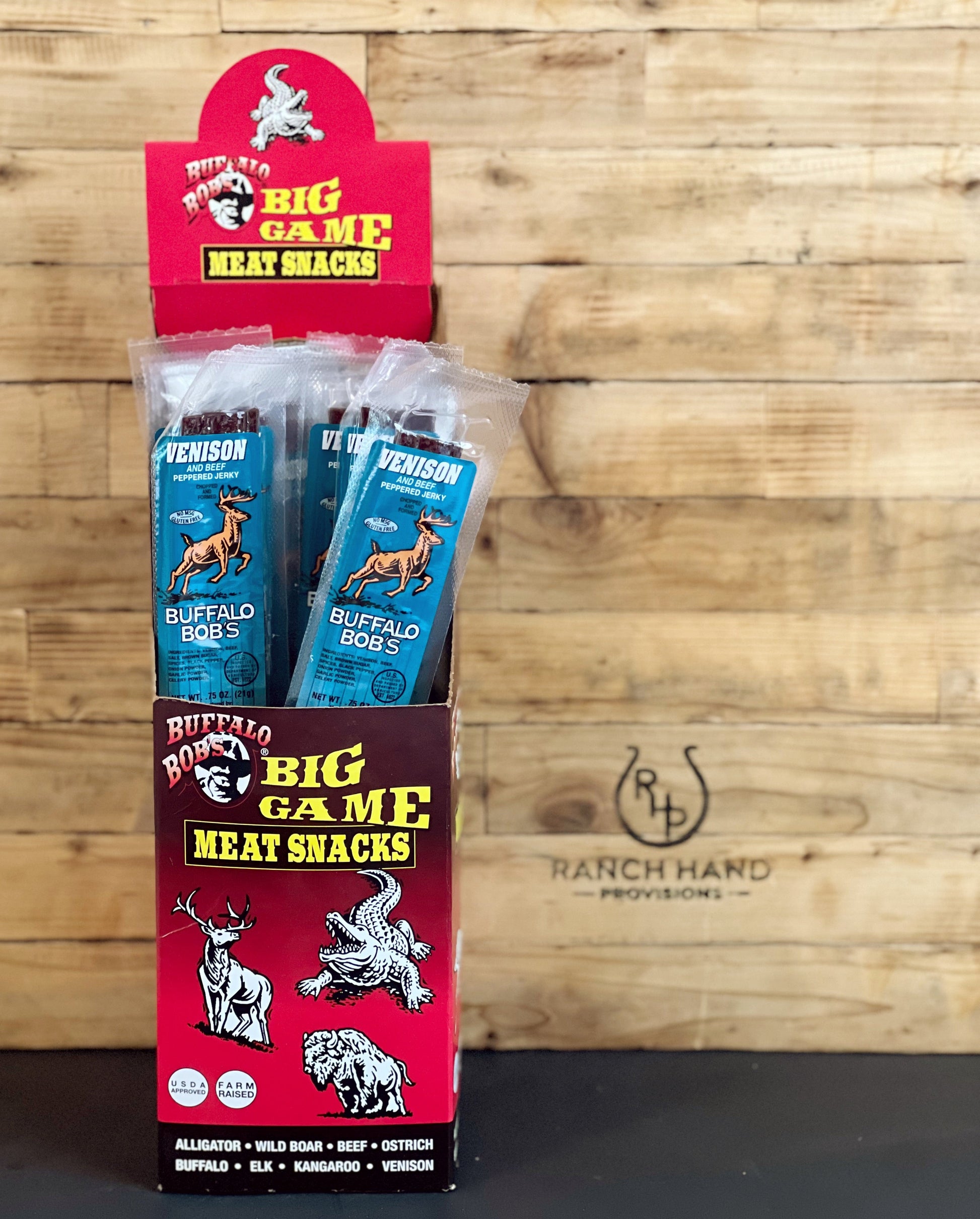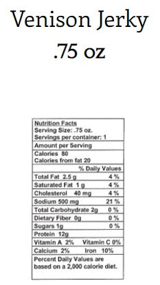 Ingredients: Venison, Beef, Salt, Brown Sugar, Spices, Black Pepper, Onion Powder, Garlic Powder, Celery Powder.