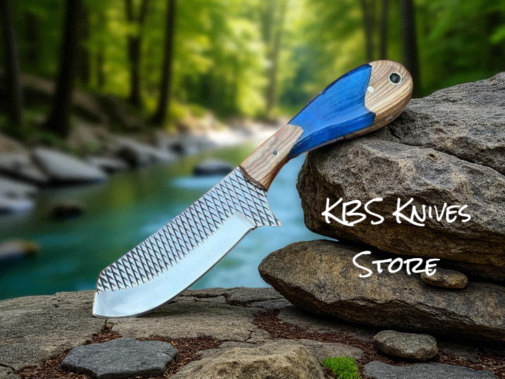 The full tang design ensures durability, while the epoxy olivewood resin handle offers both beauty and grip security. Each knife comes with a hand-stitched leather sheath, making it easy to carry on your belt and ready whenever you need it.