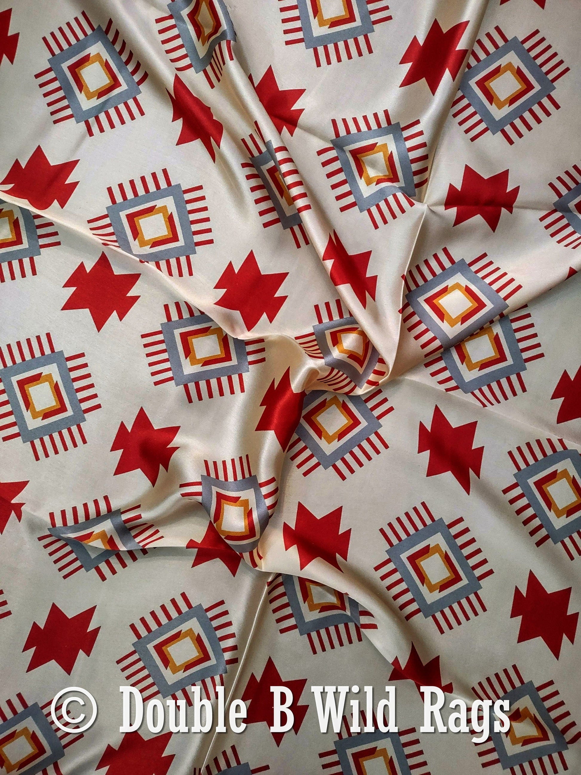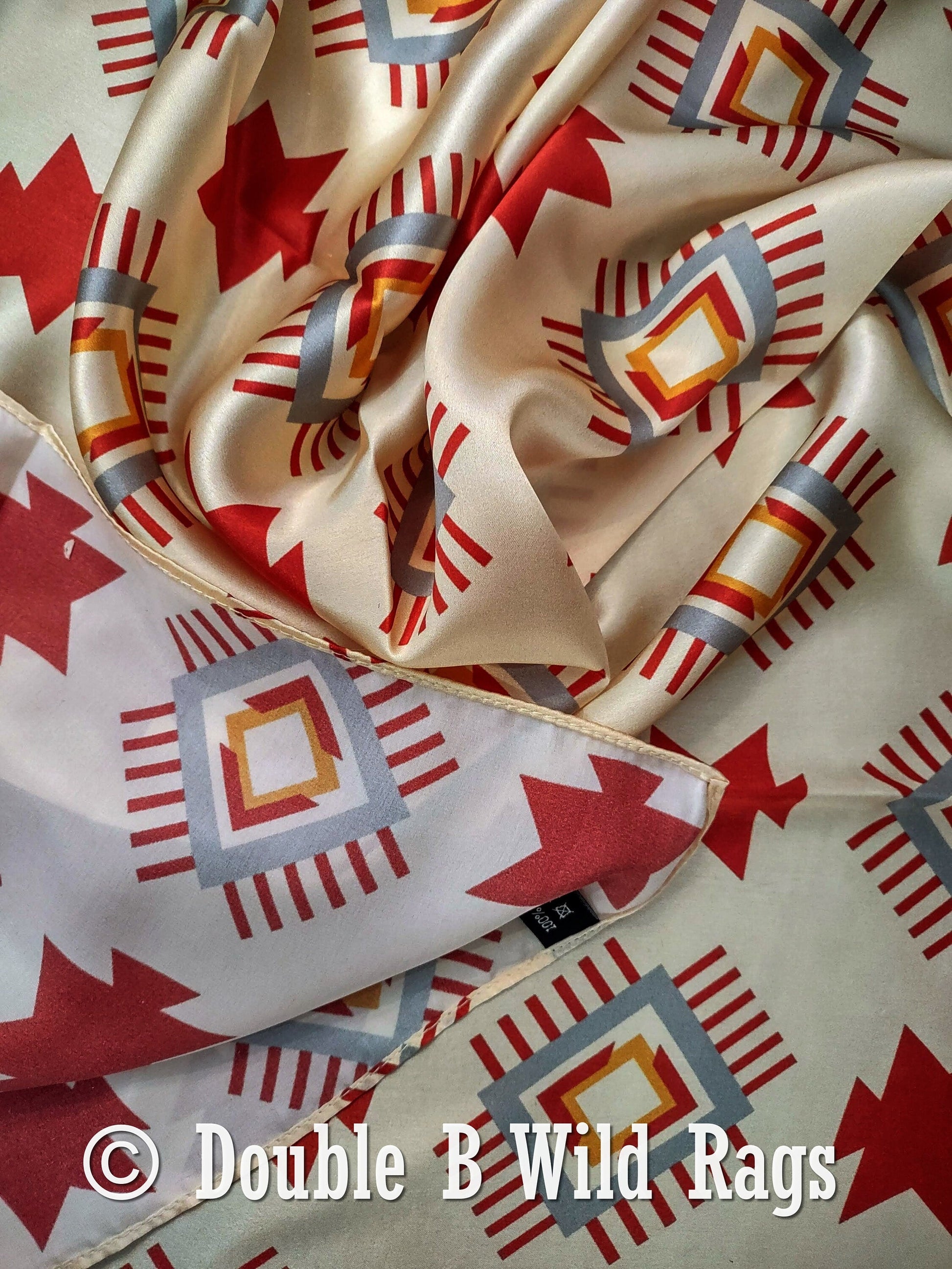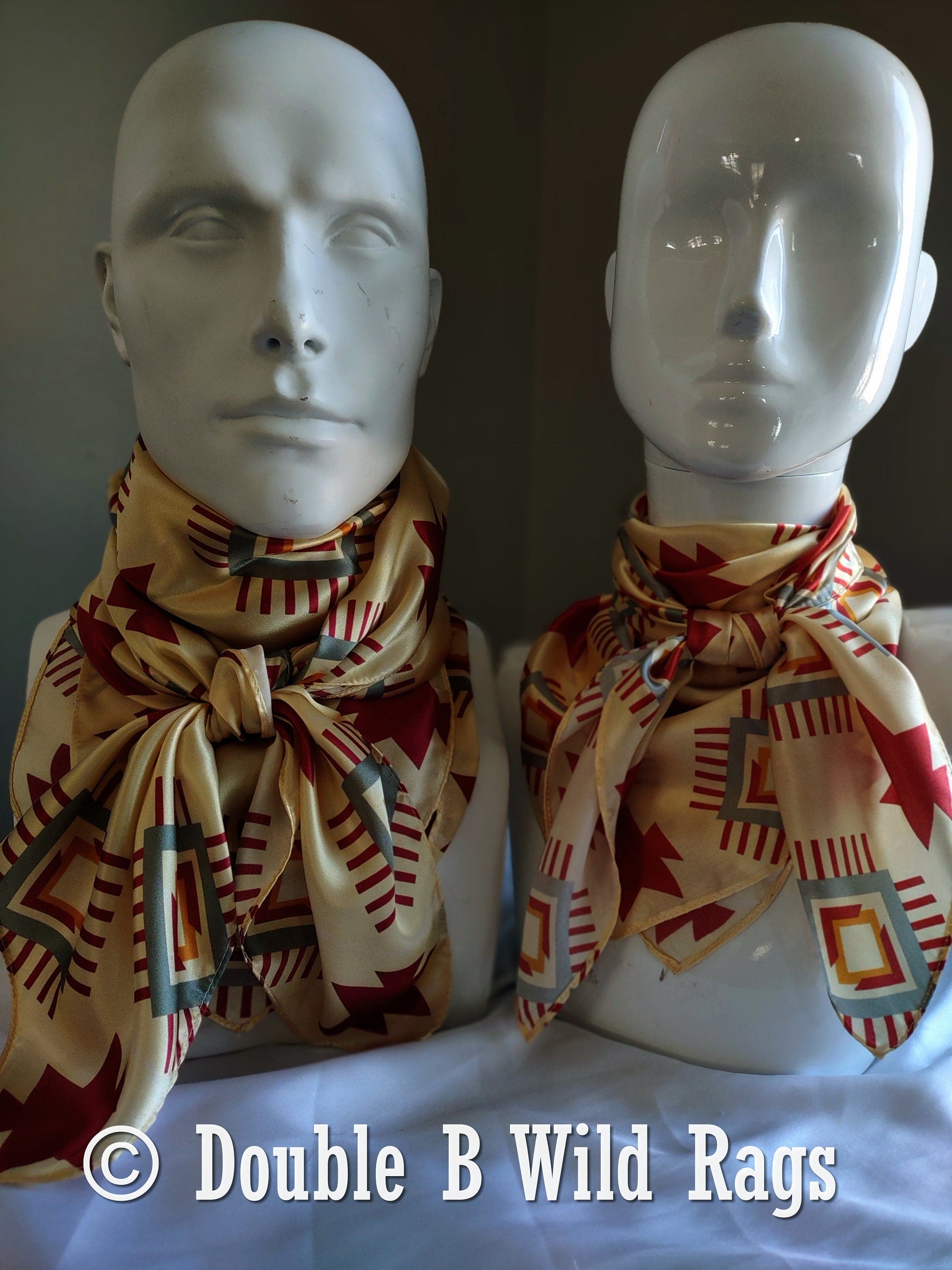 Color: Ivory wild rag with burgundy and orange Aztec inspired designs