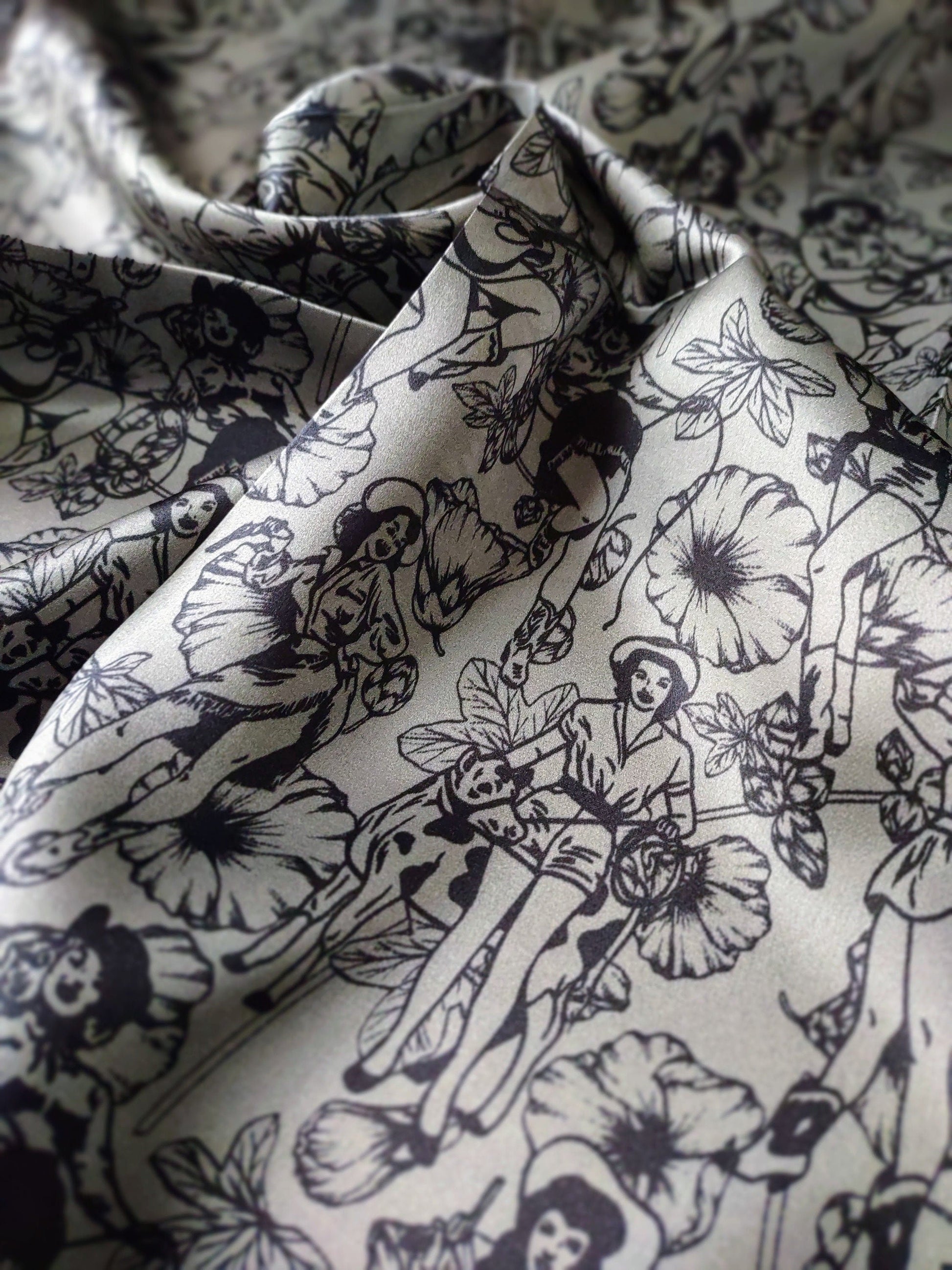 Color: Dark Charcoal Grey with Pin Up cowgirls and hollyhock flowers in black