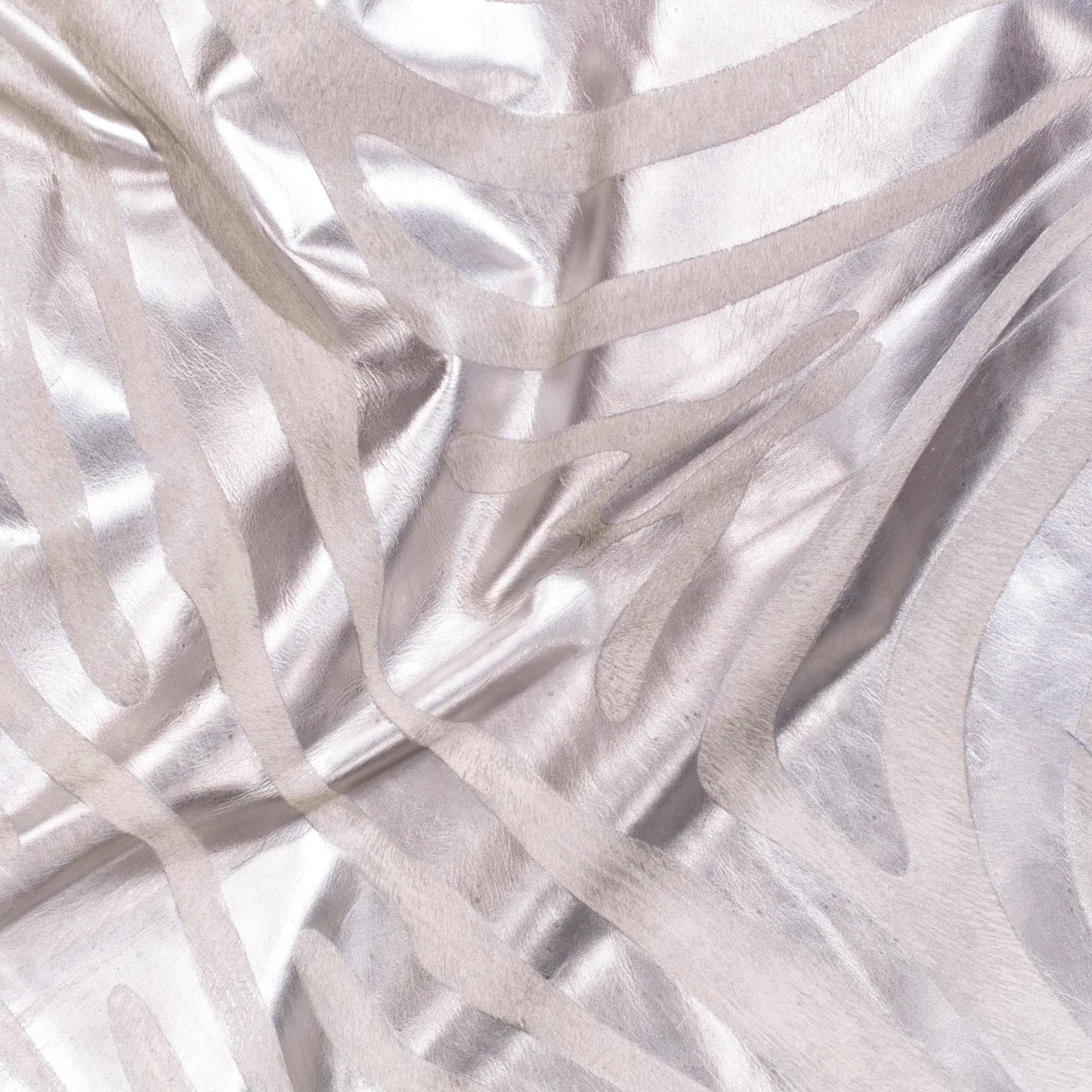 The cool metallic silver pairs effortlessly with the soft tones of the cowhide, creating a chic contrast that lights up any space. Whether you're styling a minimalist living area or a contemporary bedroom, this rug adds the perfect sleek, artistic touch. Ideal as a floor covering, wall art, or upholstery, this zebra-patterned rug offers endless design possibilities for bold decorators.